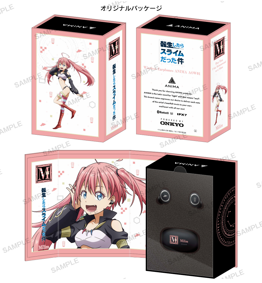 本次聯名已三位人物為主題,分別為 : 利姆路・坦派斯特、蜜莉姆·拿渥 & 迪亞布羅。設計上已人物配色與主題打造專屬充電收納盒 & 耳機,可以在外觀上見到三者各別的元素在其中。採用型號 ANIMA AOW01,當初就是以聆聽動漫歌曲打造的藍芽耳機,連續播放音樂可使用達 6 小時。