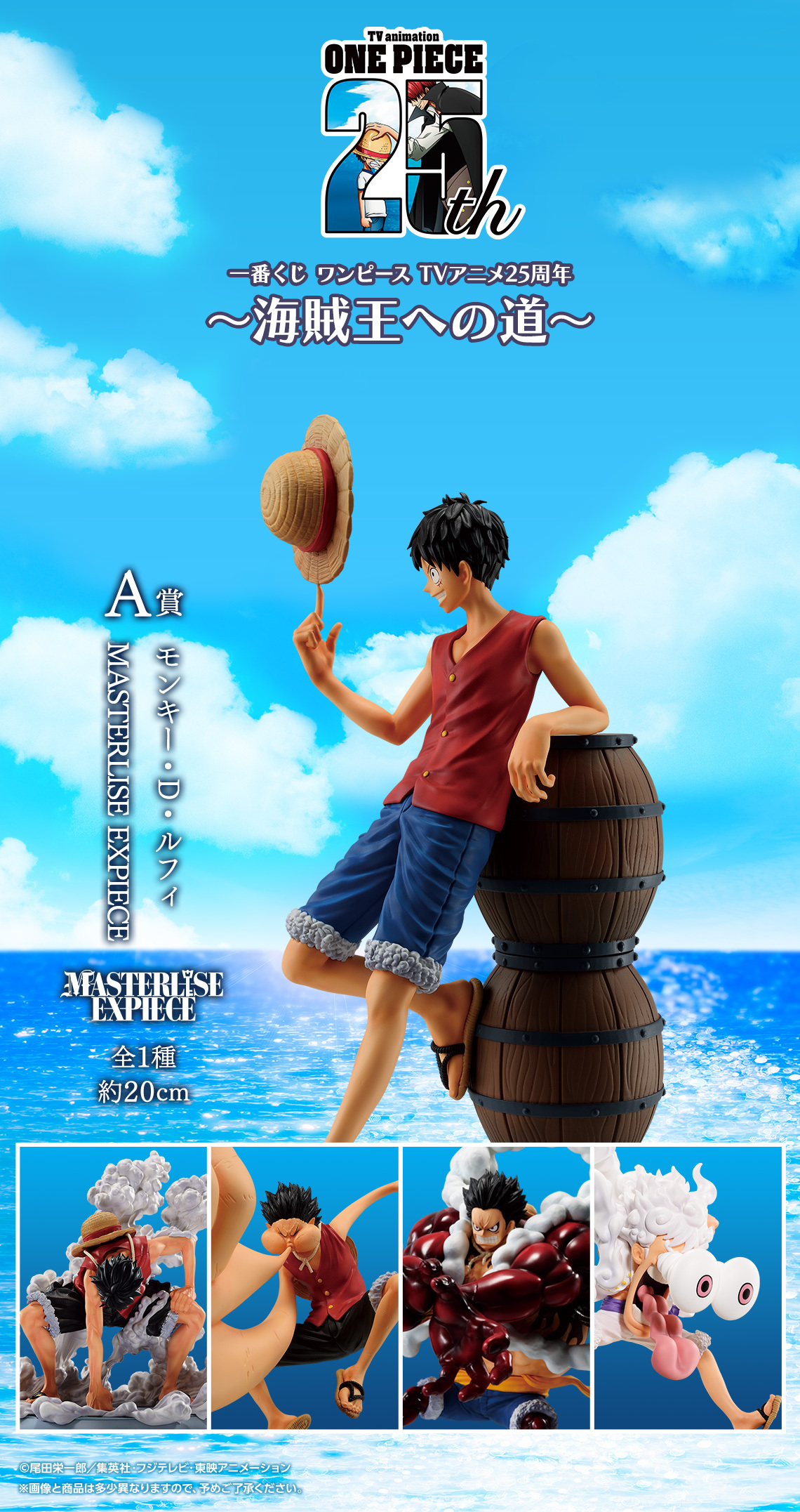 本次的「《航海王》TV 動畫 25 週年~海賊王之道~」是為紀念《航海王》TV 動畫從 1999 開播至今迎來的第 25 個年頭,提供 A~H、最後一賞與雙重中獎賞等不同級別的賞品。目前官方發布的商品圖中搶先公開了 A~D 、最後一賞與雙重中獎賞的魯夫角色模型,分別為 A 賞的蒙其·D·魯夫、B 賞與雙重中獎賞的二檔魯夫、C 賞的三檔魯夫、 D 賞的四檔魯夫以及最後一賞的五檔魯夫,將魯夫各個檔位的帥氣姿態一次收錄!