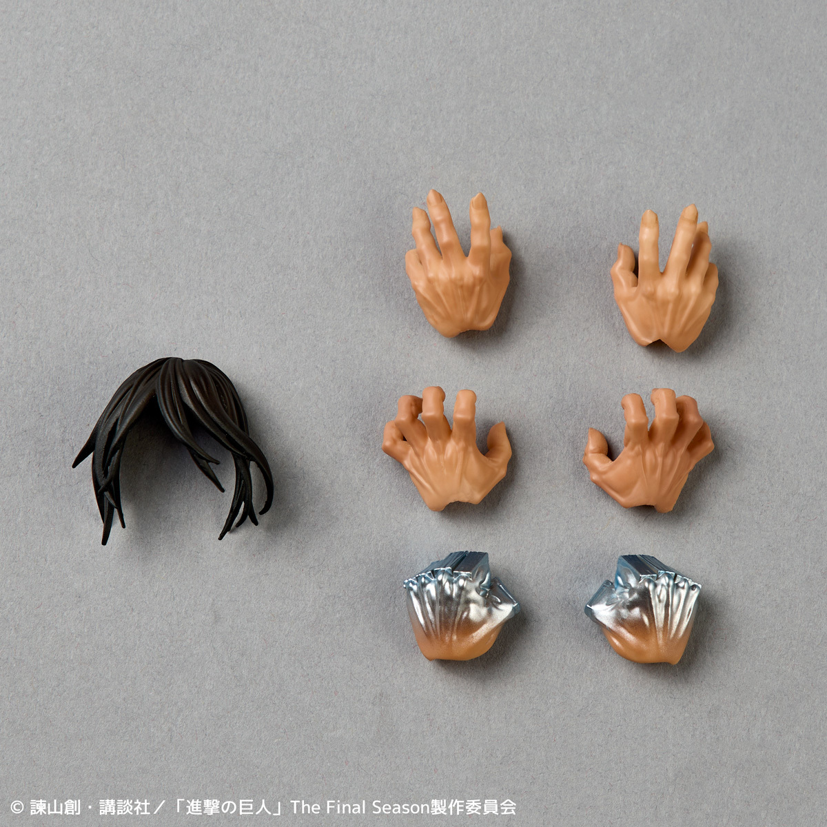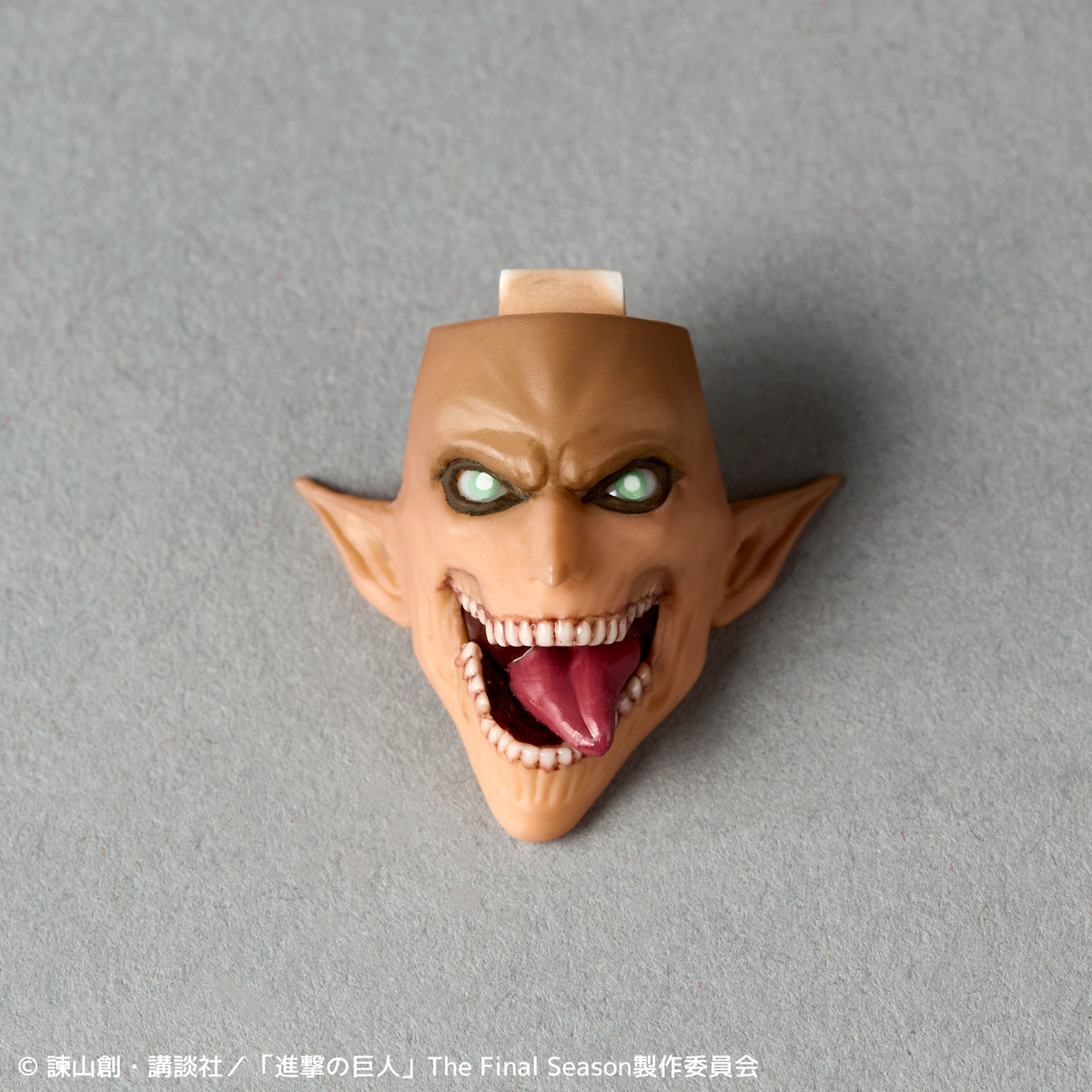 本次的「進擊的巨人」可動人偶由「AMAZING YAMAGUCHI」系列的山口勝久老師擔任監督,坂本翔太郎製作原型,還原艾連在劇中化身「進擊的巨人」時的形象,細緻的雕刻出了他身上浮誇的肌肉線條,並透過塗裝加深全身肌肉的光影對比,配件部分附上了漂浮動態的瀏海替換件以及三組手部替換件,其中也包括使用了硬質化能力的拳頭,以電鍍的形式大魄力呈現!本次在海洋堂直營店預購更將附贈張口吶喊的表情替換件,大幅展現進擊的巨人的強大氣場!