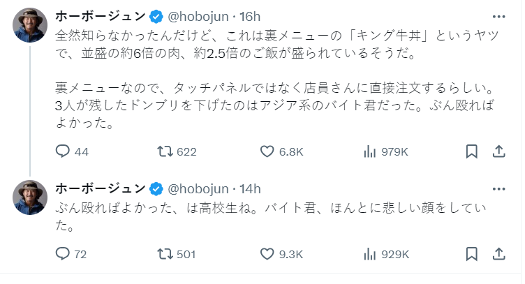 不過昨日 ( 6/16 ) 在日本 X 上卻出現一件炎上事件,有網友到店鋪用餐時,隔壁的高中生點了隱藏菜單「牛丼王」( 牛丼キング ),點完後卻在旁邊嬉鬧拍照,幾乎沒吃就走人,引起網民熱議成為 X 趨勢。