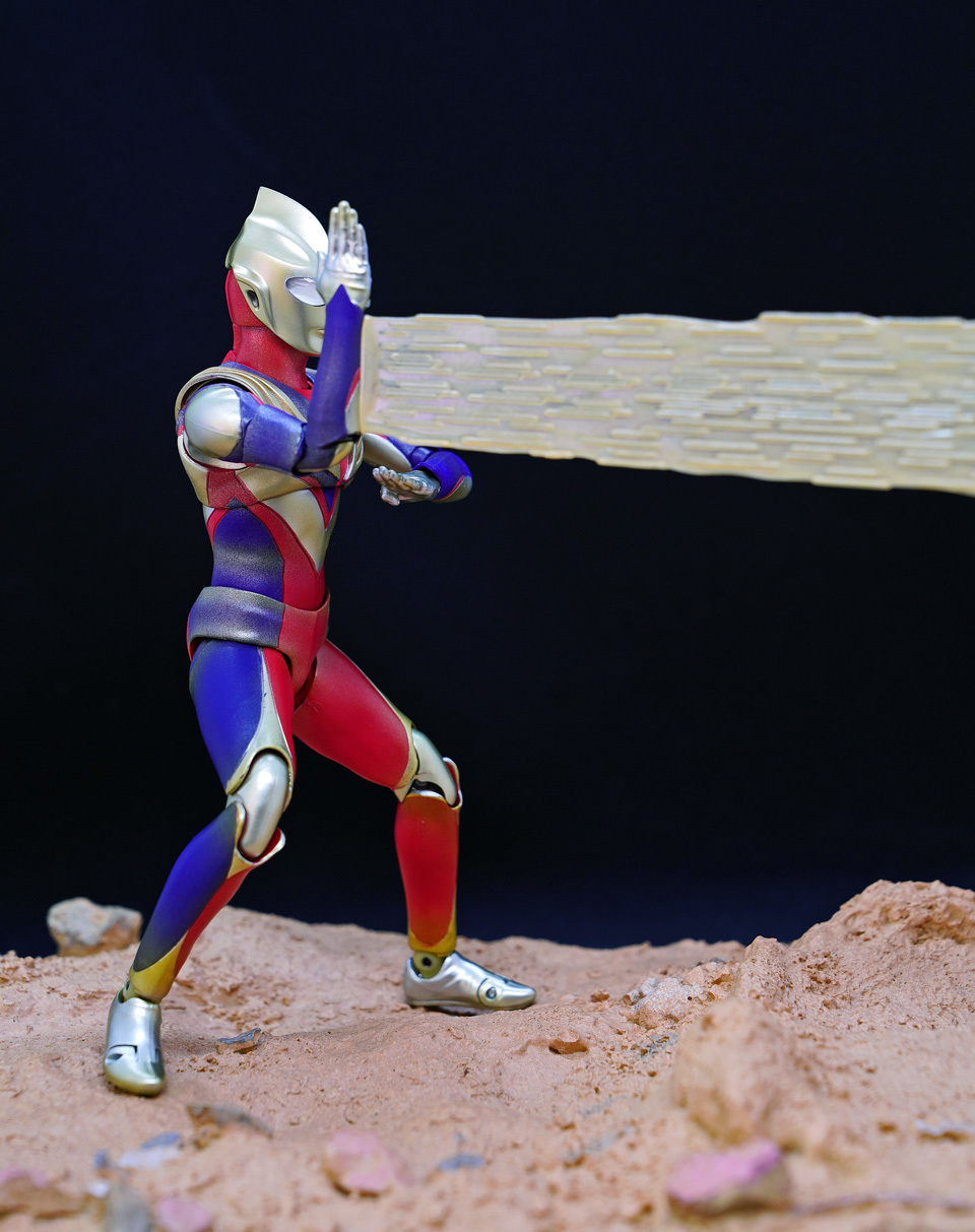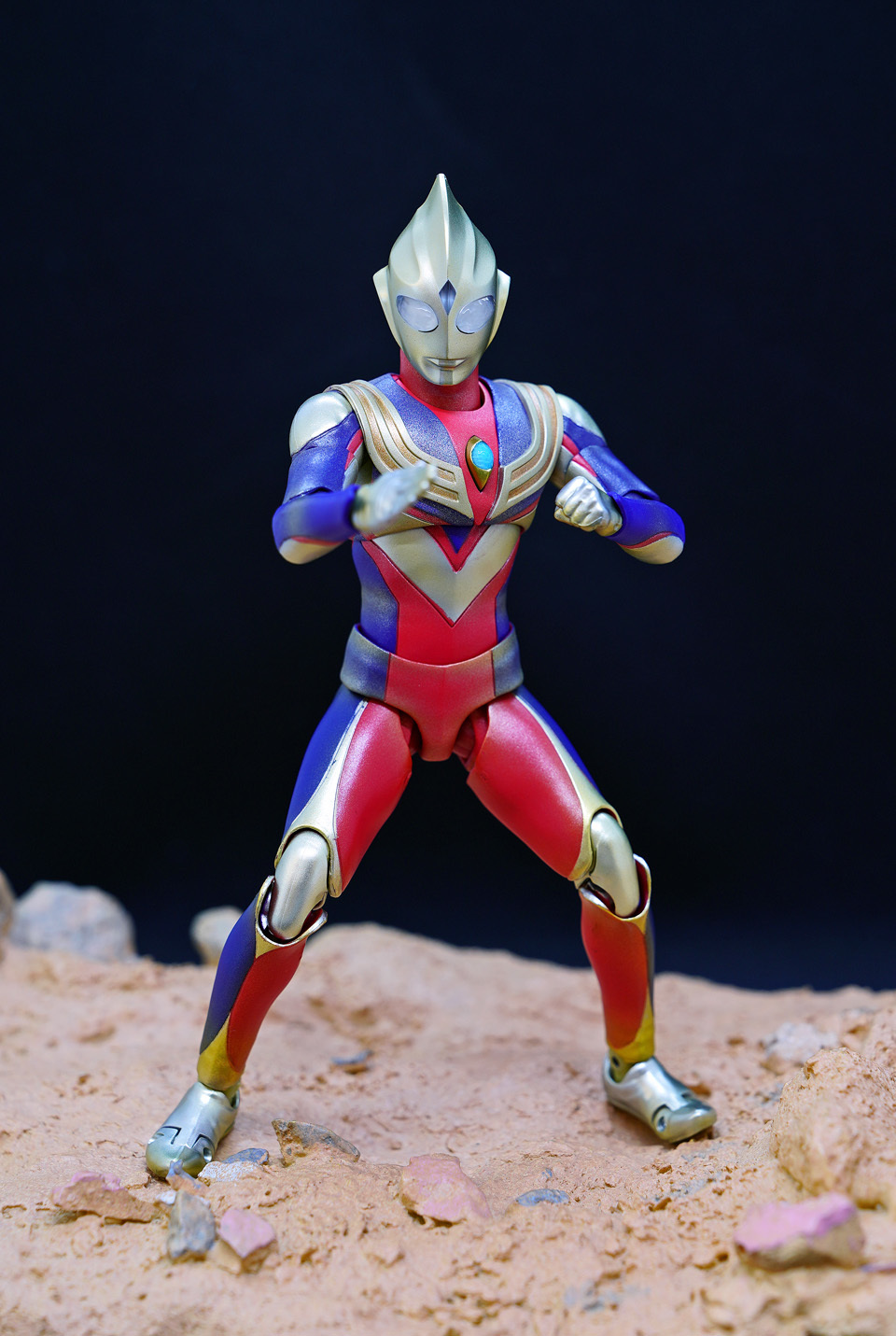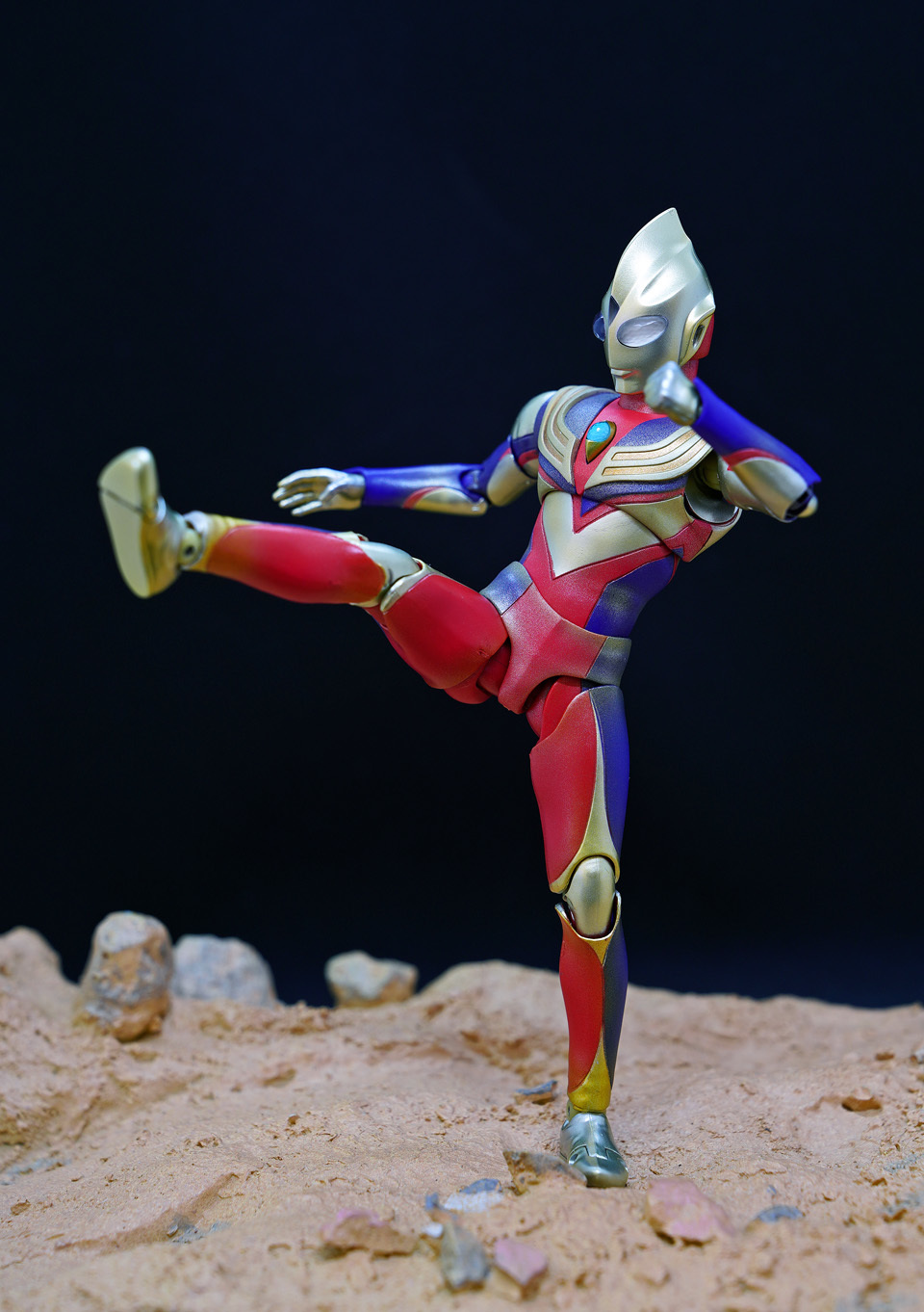 早前 Bandai 想以軟膠素體作嘗試…… 方向是好,但明顯是眼高手低了。本素體因為是 PVC 製,缺點一來是表面的塗裝極易脫色、第二是和包膠的十二寸 figure 一樣關節不能長期保持屈曲狀態,令這只我極度喜歡的廸加白白的浪費了…… 然而 Bandai 留意到上次的失敗及從中汲取教訓,今次超人系列的真骨雕 的確沒有上次迪加的 ‘’即時危險‘’!