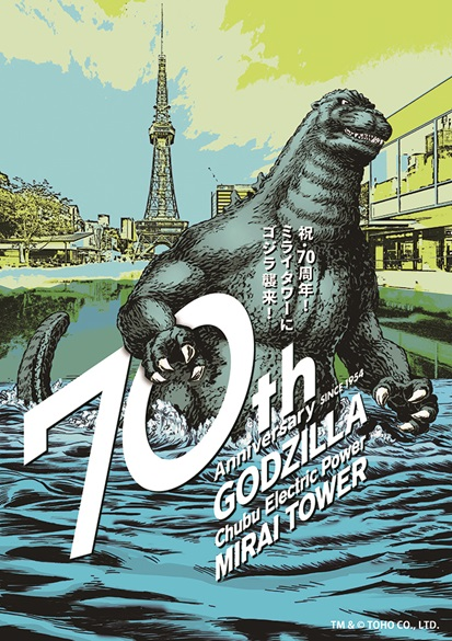 近日宣布與同樣迎來 70 周年的名古屋地標 - 中部電力 MIRAI TOWER ( 舊稱 : 名古屋電視塔 ) 合作,開設特別企劃「中部電力 MIRAI TOWERにゴジラ襲来!」,在當地塔下方的河川上,擺設了「哥吉拉水上雕像」展示,更有許多合作活動展開,於 6 月 20 日正式展開吸引粉絲朝聖。