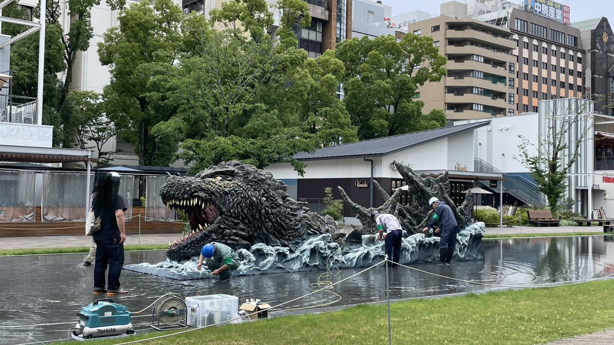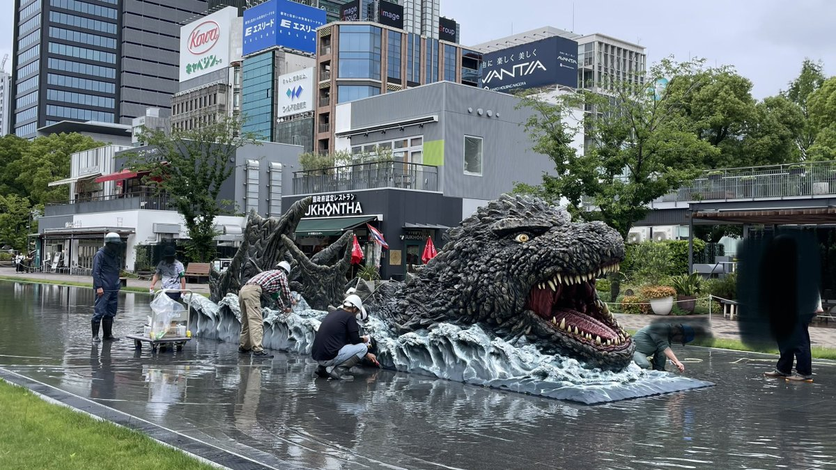 昨日 ( 6/18 ) 當地就已經開始擺設,可以看到擺設在河川上的「哥吉拉水上雕像」結合水面上制作出水花濺起的效果,露出頭部跟背鰭的哥佬就這樣現身在名古屋,真的是帥氣逼人 XD。