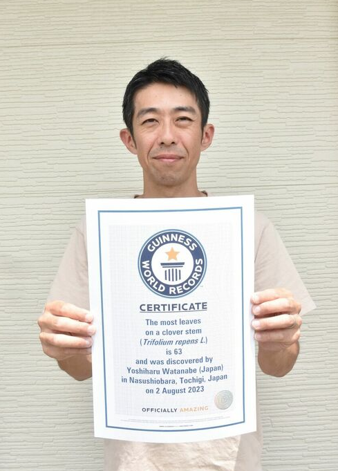 金氏世界紀錄曾經認證「全世界葉片最多的幸運草」,當時的紀錄數量是56葉。然而這位45歲的渡邊敬晴先生,以這株63葉幸運草更新了世界紀錄,成功創下新高。