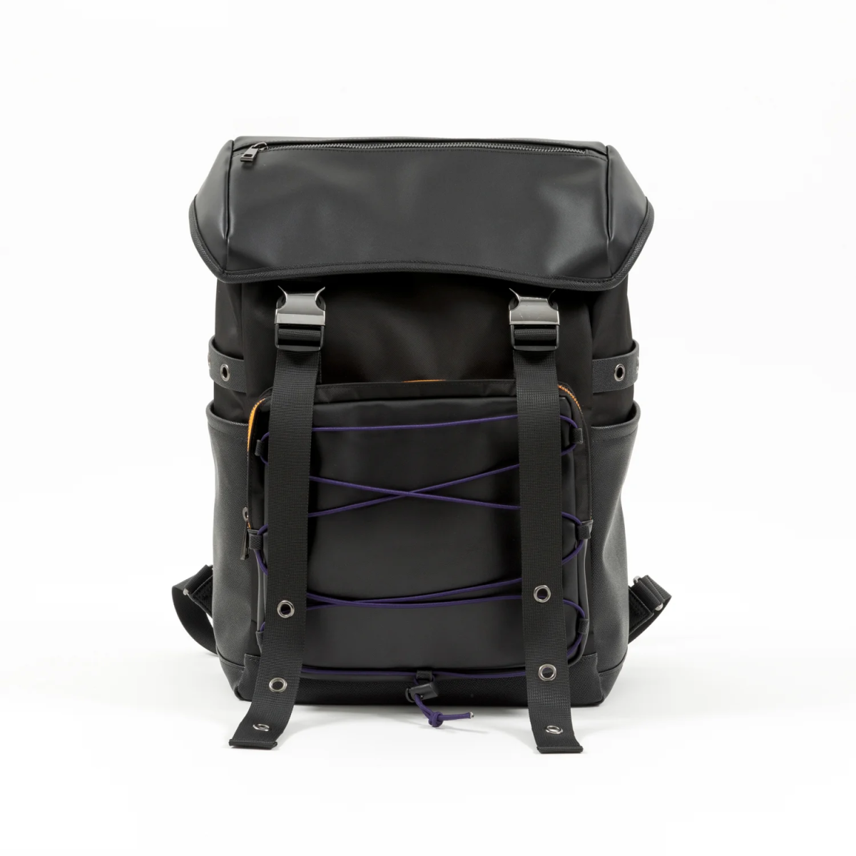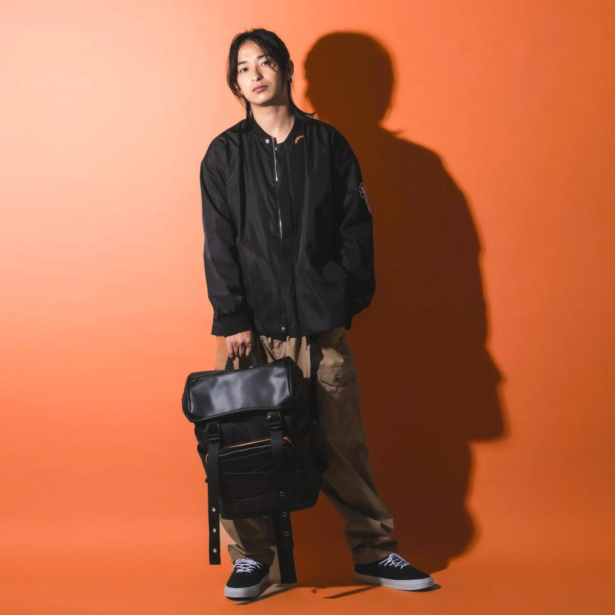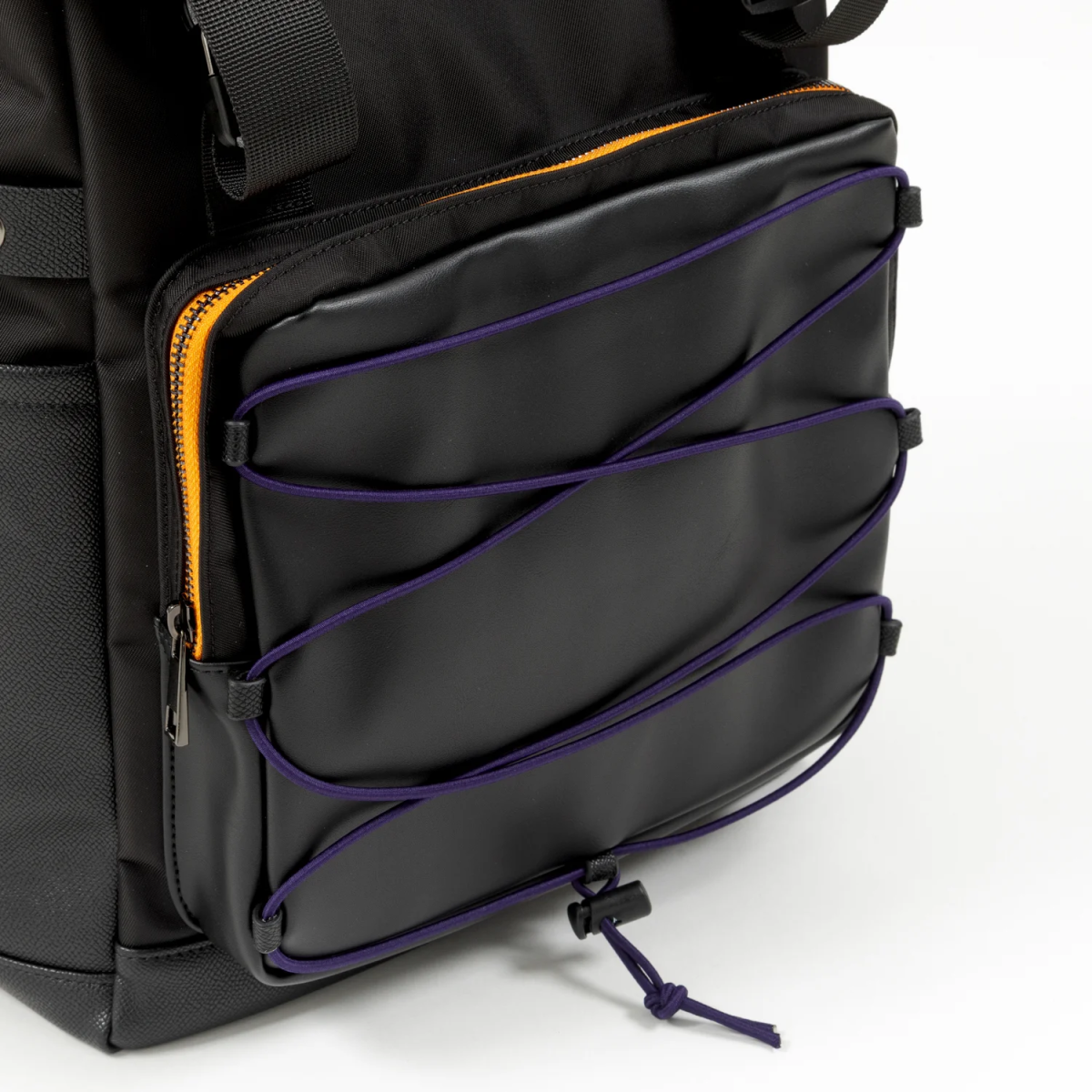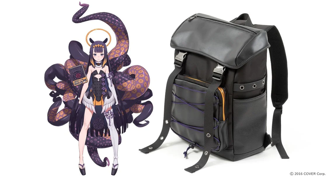 同樣以古神形象為靈感設計,整體以黑色合成皮為基礎,前方收納處配有紫色的繩線搭配橘色內裡,呼應古神的主色系。內裡還配有滿版的背景作為內襯,包含 : 髮飾、胸前裝飾、觸手和圖案以及「takodachi」可愛地散落在各處。包包本體大小適中,算是日常生活方便使用的尺寸。
