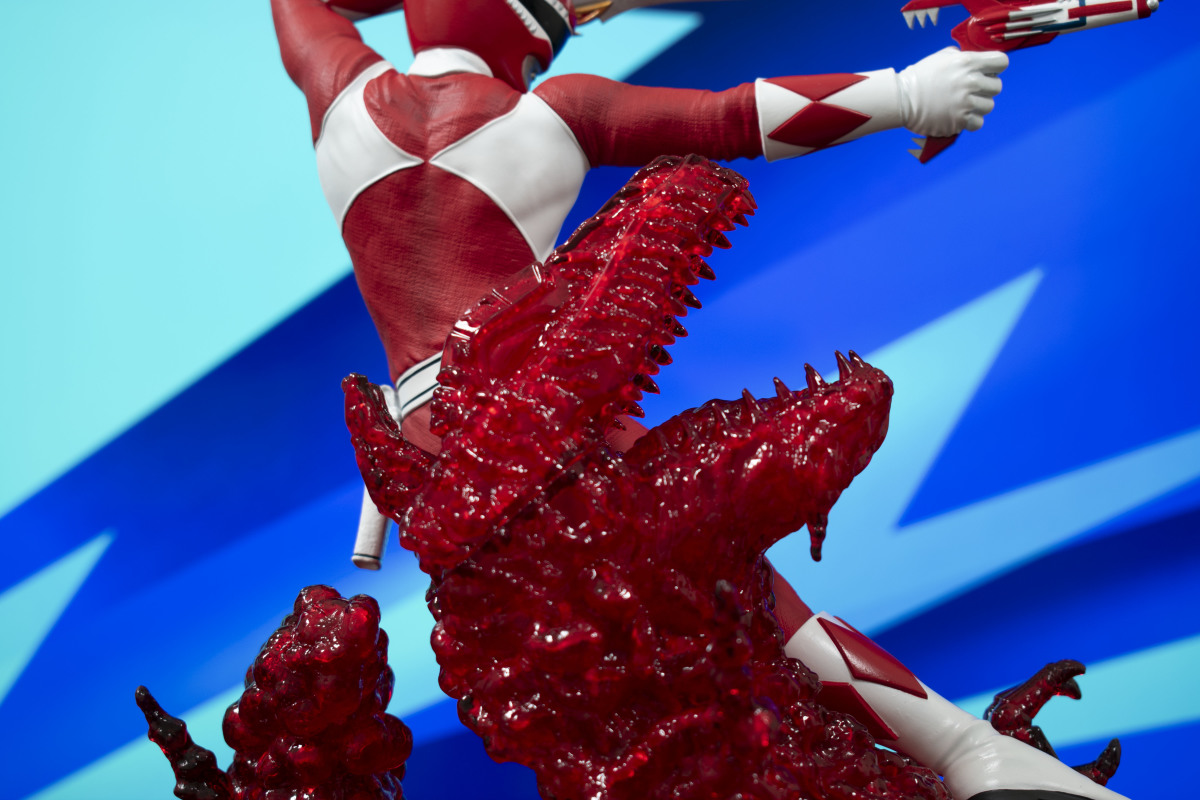 本次推出的「紅衣戰士」PVC 雕像高約 27.9 公分,以初代紅衣戰士取自《恐龍戰隊獸連者》「暴龍連者」的造型打造,細節雕刻出頭盔光滑的質感以及衣服的皺褶細節,呈現紅衣戰士手持龍擊劍(Ranger Sword)以及連者槍(Ranger Gun)的躍動姿態,連接腿部延伸作為底座的大份量紅色能量特效也雕刻出了紅衣戰士代表的神獸暴龍,搭配騰空的動態展現出強大的魄力!