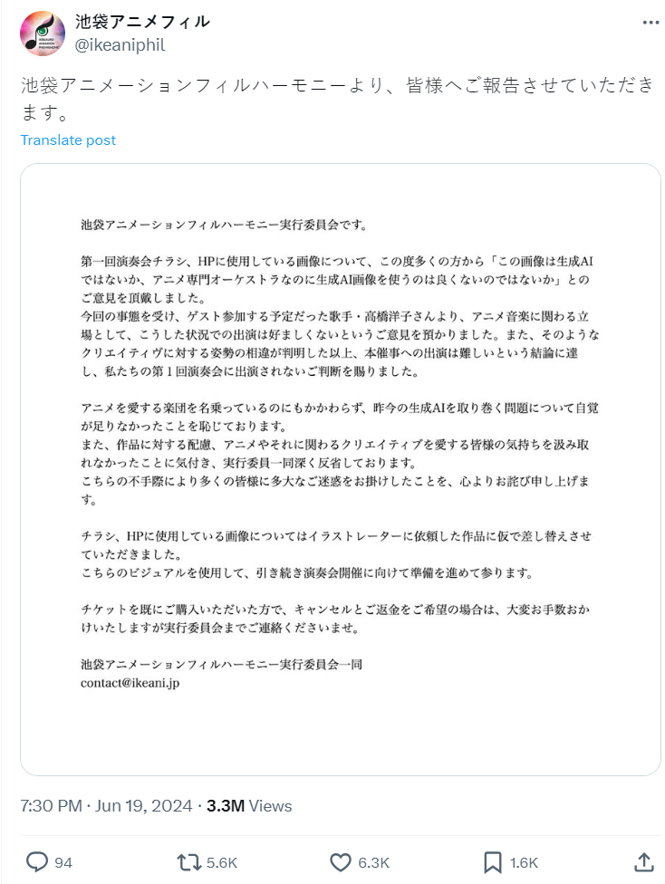 因為這個緣故,「池袋動畫交響樂團」官方立即更新的宣傳海報圖,暫時替代原本 AI 生成的視覺。對於這樣的風波,未來會更加注意,也請大家關注在音樂表演的部分,希望大家支持池袋當地的動漫音樂演出,會努力帶給大家最好的演出。