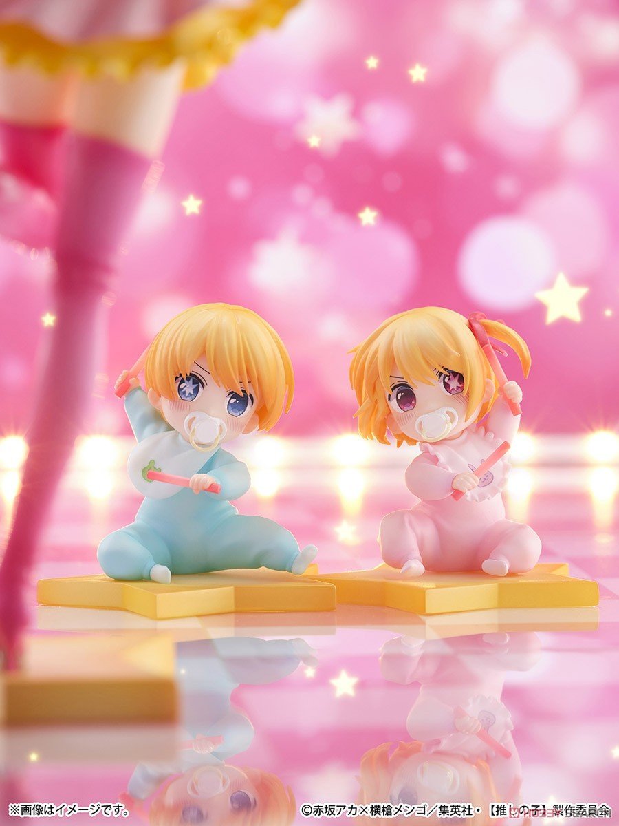 本次的「星野愛、阿奎亞&露比」1/7 比例塗裝完成品分為星野愛、阿奎亞和露比三部分,星野愛高約 25.5 公分,以星野愛的偶像服裝造型打造,細緻刻畫出她纖細的身材比例、飄逸的紫粉色頭髮以及充滿魅力的笑容,並塗裝還原她標誌性的星形眼睛,在星形底座旁也作有星星造型的配飾,展現出她在作品中迷人的偶像魅力!阿奎亞和露比則分別高約 6.9 公分及 6.8 公分,以雙胞胎打御宅藝時的可愛模樣打造,擺在愛的旁邊大幅提升整體可愛的視覺效果!