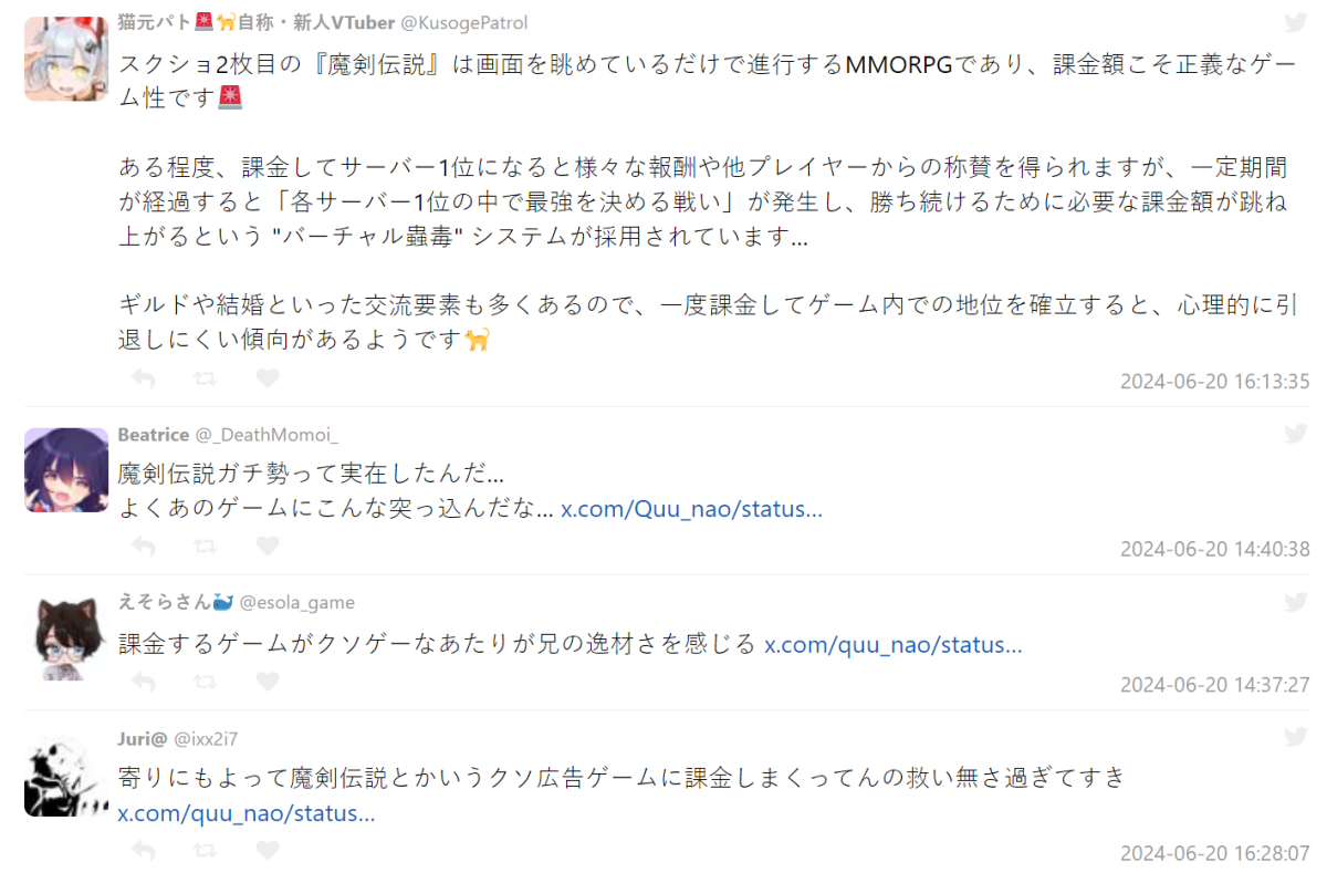 有網友發現部分花費在這一款手遊《魔劍傳說》上,事實上這是一款中國開發發行的戰略 MMORPG,日本也算有點人氣的遊戲,但看來推主哥哥是砸了不少在上頭。