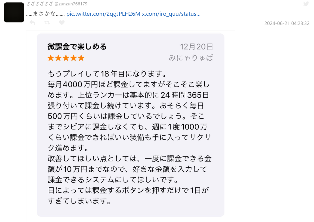 甚有網友在該遊戲的 app 評論區上,找到一個可能是該推主哥哥的發文,從評論上就看得出來花費不少金額,雖說真假難辨,但可以看出這款手遊的玩家真的都很願意砸錢。