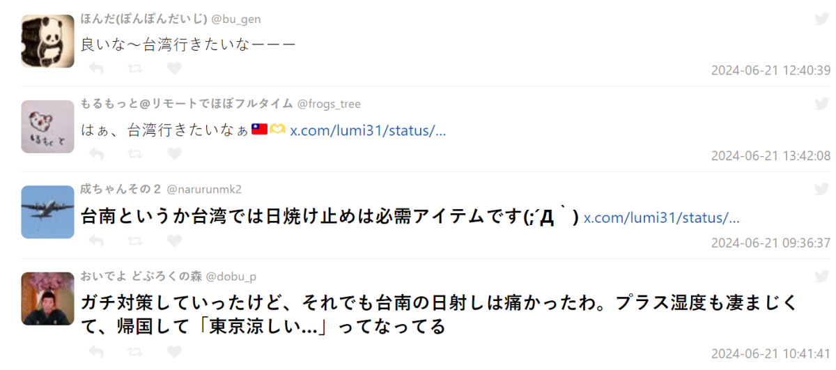 當然近來已經進入夏天,六月的台南可說是有著炎熱的氣候絕非說說,不少日本網友也指出到台灣南部遊玩,真的要記得防曬,真的不要小看台灣的炎熱。