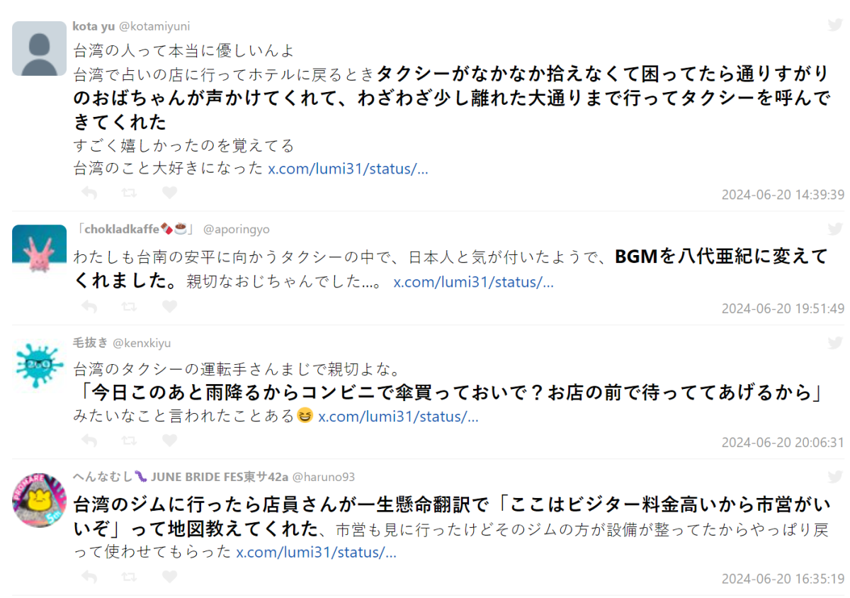 亦有網友分享,先前要上計程車,司機還主動跟他說 : 「稍晚可能會下雨唷,要不要先到超商買把傘,我會在店門口等你。」,讓他印象深刻。甚至有網友分享到健身房,服務員用盡心力跟他講解翻譯,還跟他說 : 「這裡費用較高,推薦你到國民運動中心就可以了。」,給他一張手繪的地圖讓他成功到達目的地。