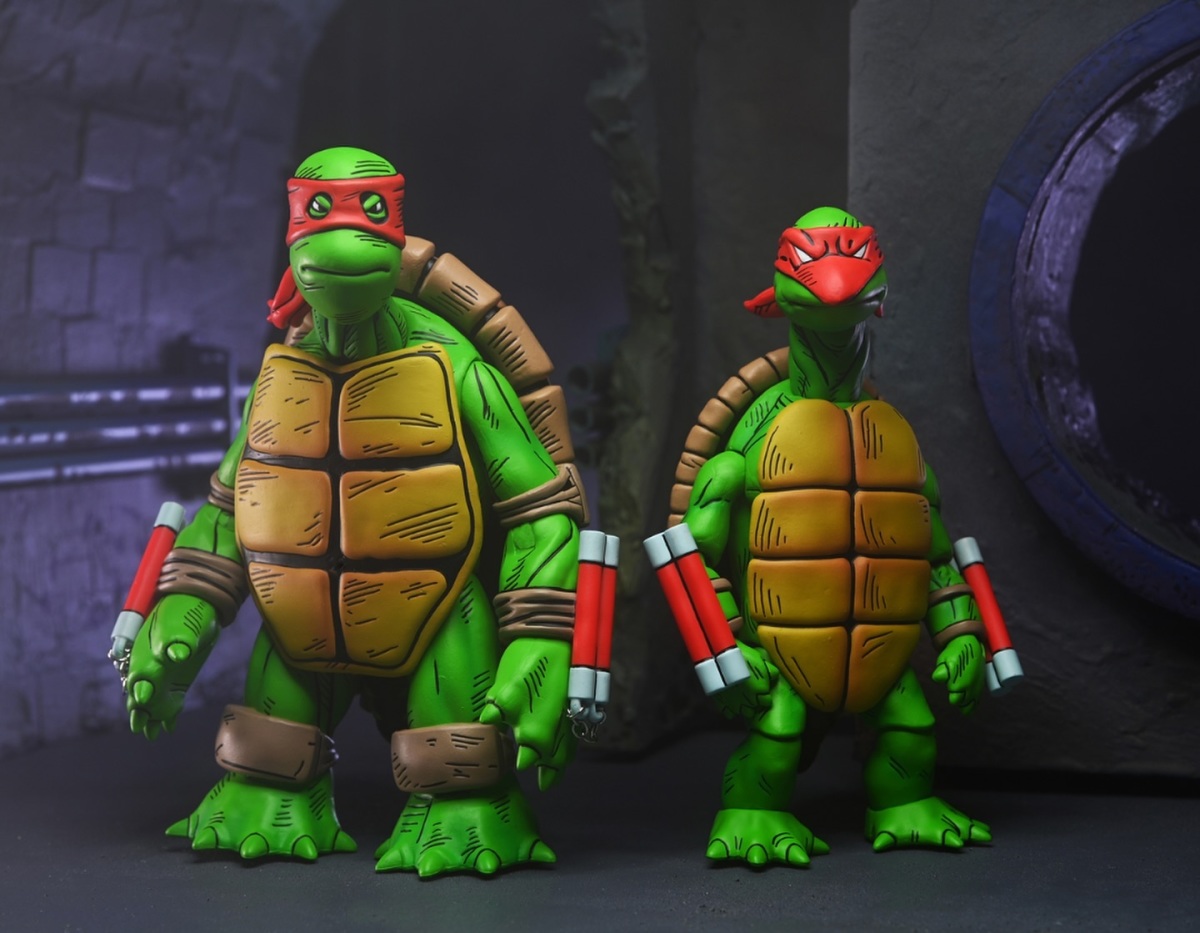 本次的商品將最初兩隻烏龜塗鴉的形象立體化製作為 7 吋可動人偶,以塗鴉中兩隻烏龜有些滑稽的身體比例打造,塗裝以經典幻影漫畫版忍者龜的紅綠配色呈現,配件附上了兩隻烏龜各一顆的替換頭雕以及各一對的替換手,並收錄風格化的、我們熟悉的四隻忍者龜標誌性的武器——武士刀、筆架叉、長棍以及雙節棍,能夠組合擺設各種姿勢!雖說可動表現看起來普普,但能有機會入手最初塗鴉造型的可動人偶還是非常的讓人期待啊!