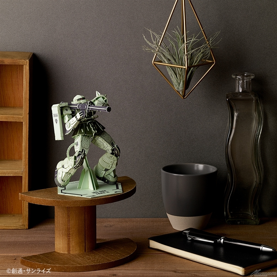 專注於紙藝術的『si-gu-mi PRO』3D 拼裝紙模,以透過雷射切割 1mm 厚紙板為零件,精準地呈現精密的機械細節,且無需使用黏著劑即可輕鬆組裝;設計專用底座能夠展示充滿動態感的造形。『si-gu-mi PRO MS-06S 夏亞專用薩克II』紙模,首次使用染色紙來再現機體的色彩,透過「珊瑚色」染色紙實現紅色彗星的形象。零件數共有 297 件,完成後總高度約 133 mm,呈現出在外太空發射薩克機槍的姿勢!