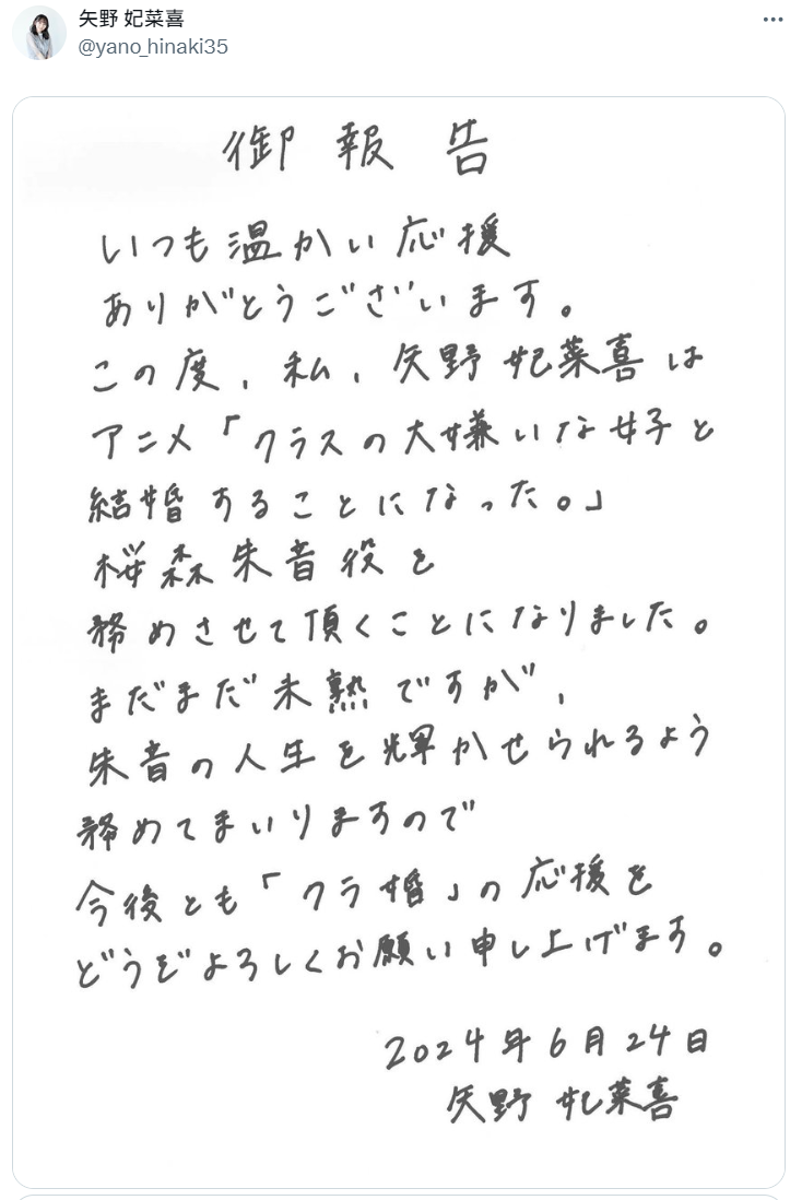 各位可以看看矢野妃菜喜的「結婚報告風」文案,不但用上「御報告」如此正式的開頭,字字句句都類似結婚的標準文案來宣傳,當然這也是呼應演出作品《我和班上最討厭的女生結婚了。》女主角櫻森朱音的心情,只能說矢野妃菜喜真的很會玩阿 ( ? )
