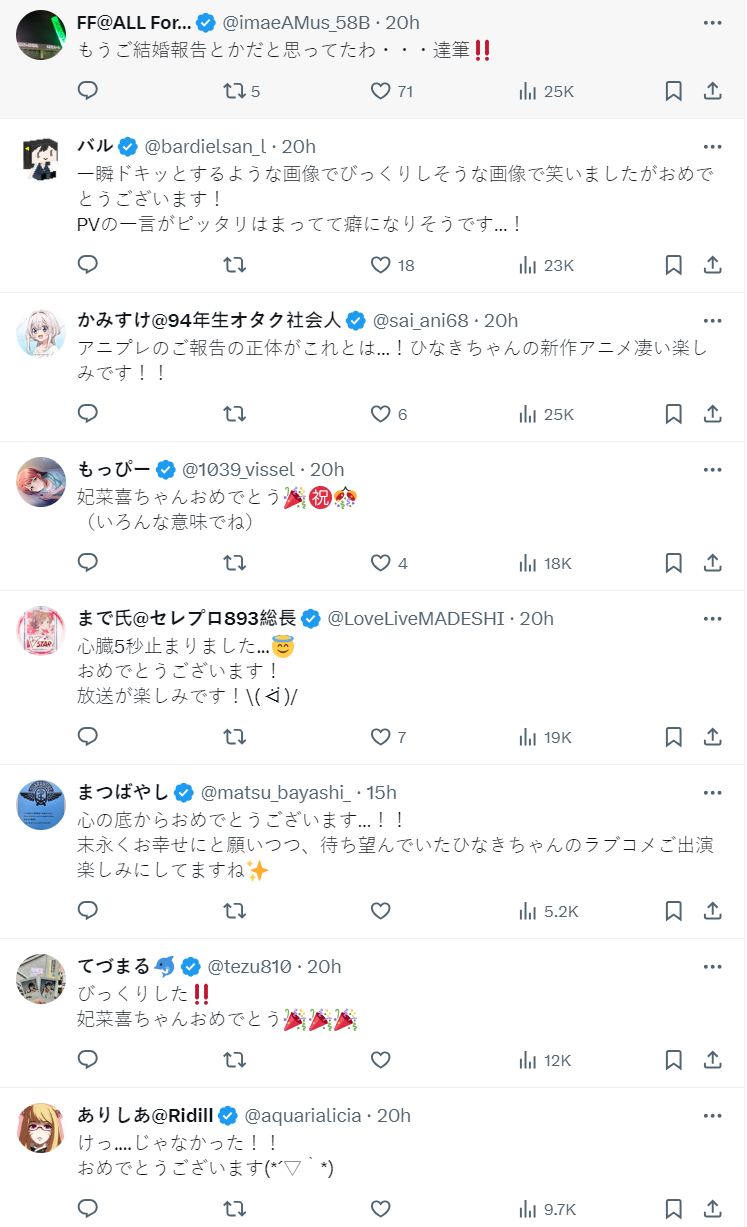 發布「結婚報告風」文案沒多久,矢野妃菜喜馬上再發較為平凡的聲優出演報告文,也開玩笑說讓大家嚇到了有點抱歉,還是希望大家多多支持 www。