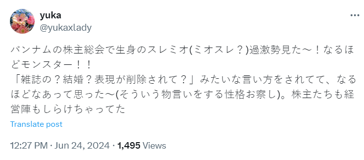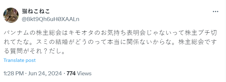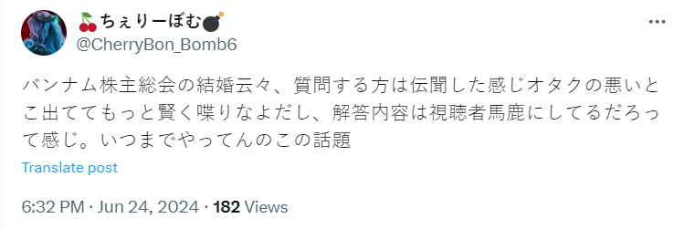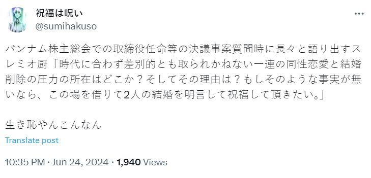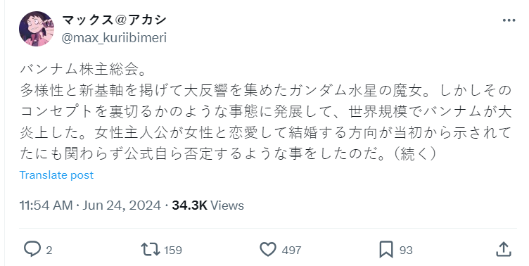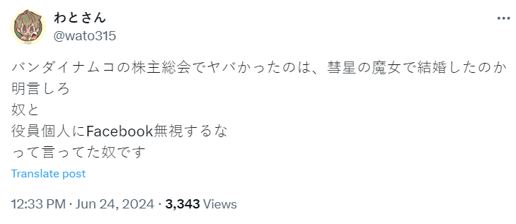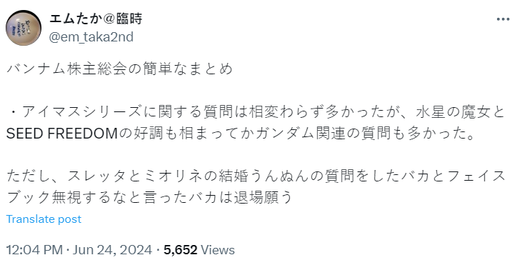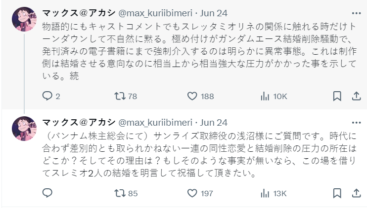 該名發言「蘇米結婚立場」的股東也在 X 上發文,表示《機動戰士鋼彈 水星的魔女》是個富含多樣性與嶄新利基的作品,卻發生官方否認了這兩位主角結婚的事實,對此感到非常憤怒,才會在股東會提起這件事情。