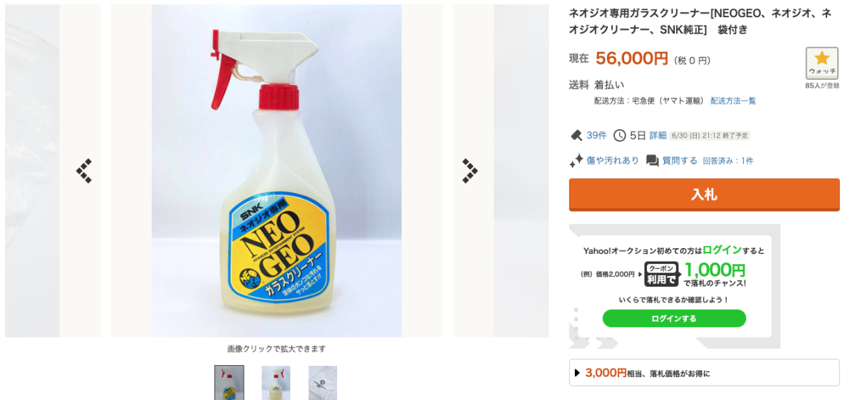 近日,日本Yahoo拍賣上出現了一款「NEOGEO專用玻璃清潔劑」,引起了老遊戲玩家的注目。而這一罐乍看不起眼的清潔劑,已經吸引了39次出價,價格更是飆升至56000日圓。