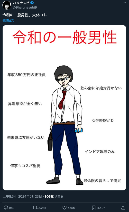 而最近X上有位圖文作者「ハルナスビ(@9harunasubi9)」,畫出了「令和的一般男性」,也迅速引起網友注意,已經獲得了超過4萬個讚。