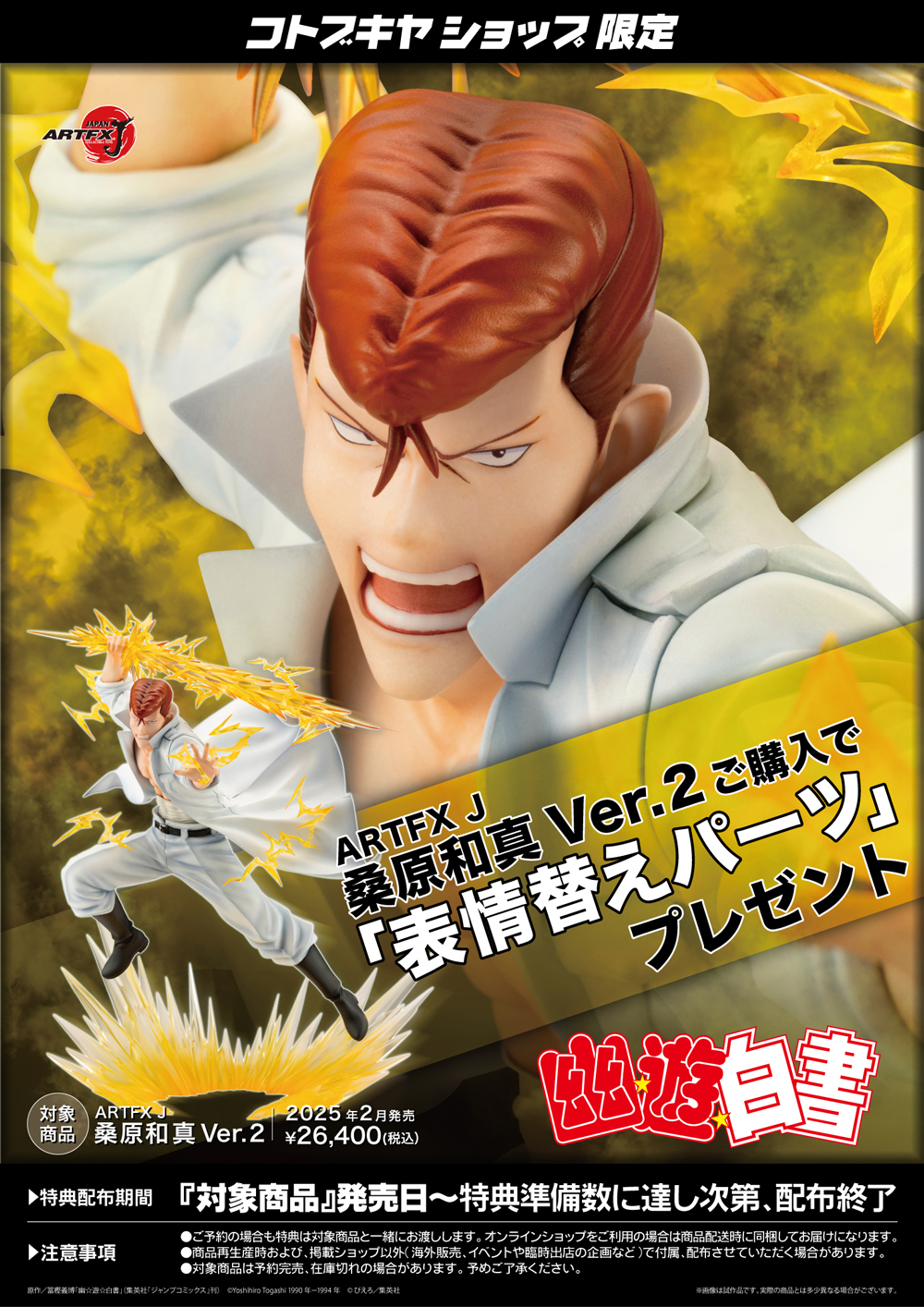 日本模型商 壽屋旗下打造日本動漫、遊戲角色精緻立體作品的「ARTFXJ」,正式發表了出自經典動畫《幽☆遊☆白書》的第二彈商品:『ARTFX J 幽☆遊☆白書 桑原和真 Ver.2』1/8比例模型!參考售價為 26,400 日圓,預計將於 2025 年 02 月發售。
