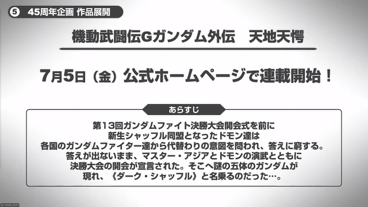 在 4 月初的「機動戰士鋼彈系列 45 周年」直播節目中,揭露了《機動武鬥傳 G鋼彈》30 周年的計畫,更在節目中透漏了新人物的設定圖,後續也確定是由當年《機動武鬥傳G鋼彈》動畫總導演今川泰宏來操刀的外傳漫畫作品。