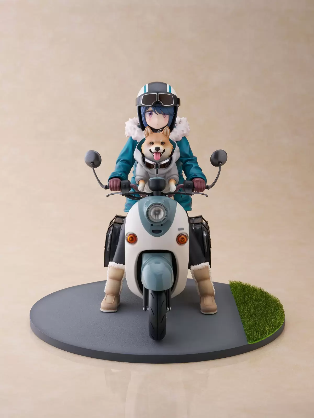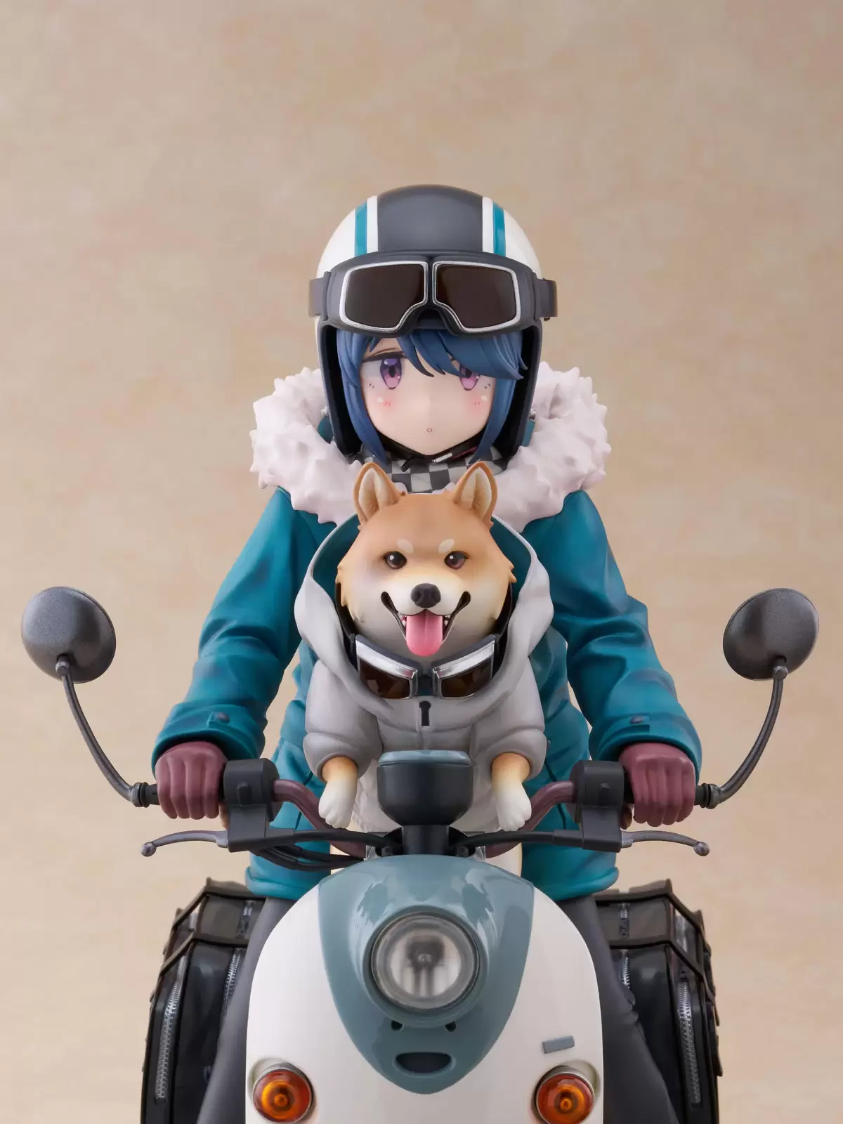 「志摩凜」1/7 比例塗裝完成品,忠實再現了漫畫第11卷內封面的插圖!尺寸約高 20.5 公分,還原志摩騎著愛車 Vino 速克達,還載著狗狗(芝麻有練過,凡人不要學)的造型。平淡放鬆的表情加上臉頰柔軟的質感讓她看起來很可愛~穿上羽絨外套的狗狗也相當生動~衣服的細小皺紋搭配陰影塗裝,營造出更具立體感的效果。安全帽、靴子等插畫看不到的細節也都徹底再現!機車刻劃出車燈、儀表板、後照鏡到機械構造...等精密造型,細膩塗裝出塑膠車殼的光澤感與金屬零件的厚重感,打造逼真質感。