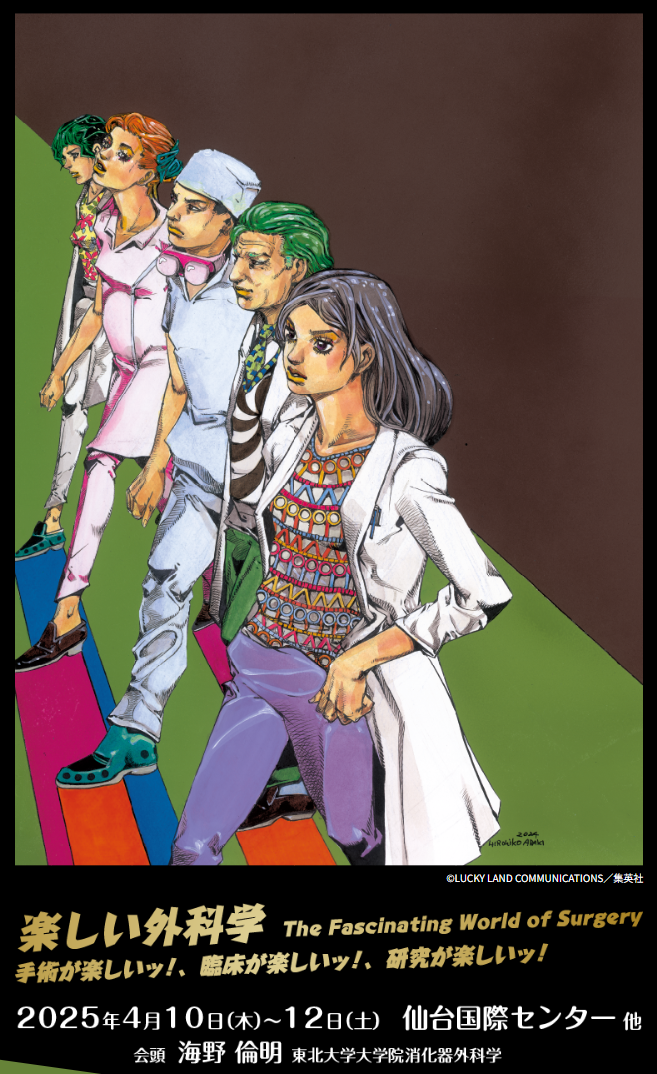 不過荒木飛呂彥的魅力不可只在 ACG 圈,先前就曾受東京律師會邀請成為官方形象角色選拔的選考委員,更表明律師圈都非常喜歡荒木老師。近期又受到日本外科學會邀請,繪製定期學術集會的宣傳視覺,連醫學界都希望使用荒木老師的創作,也引發網民迴響與關注。