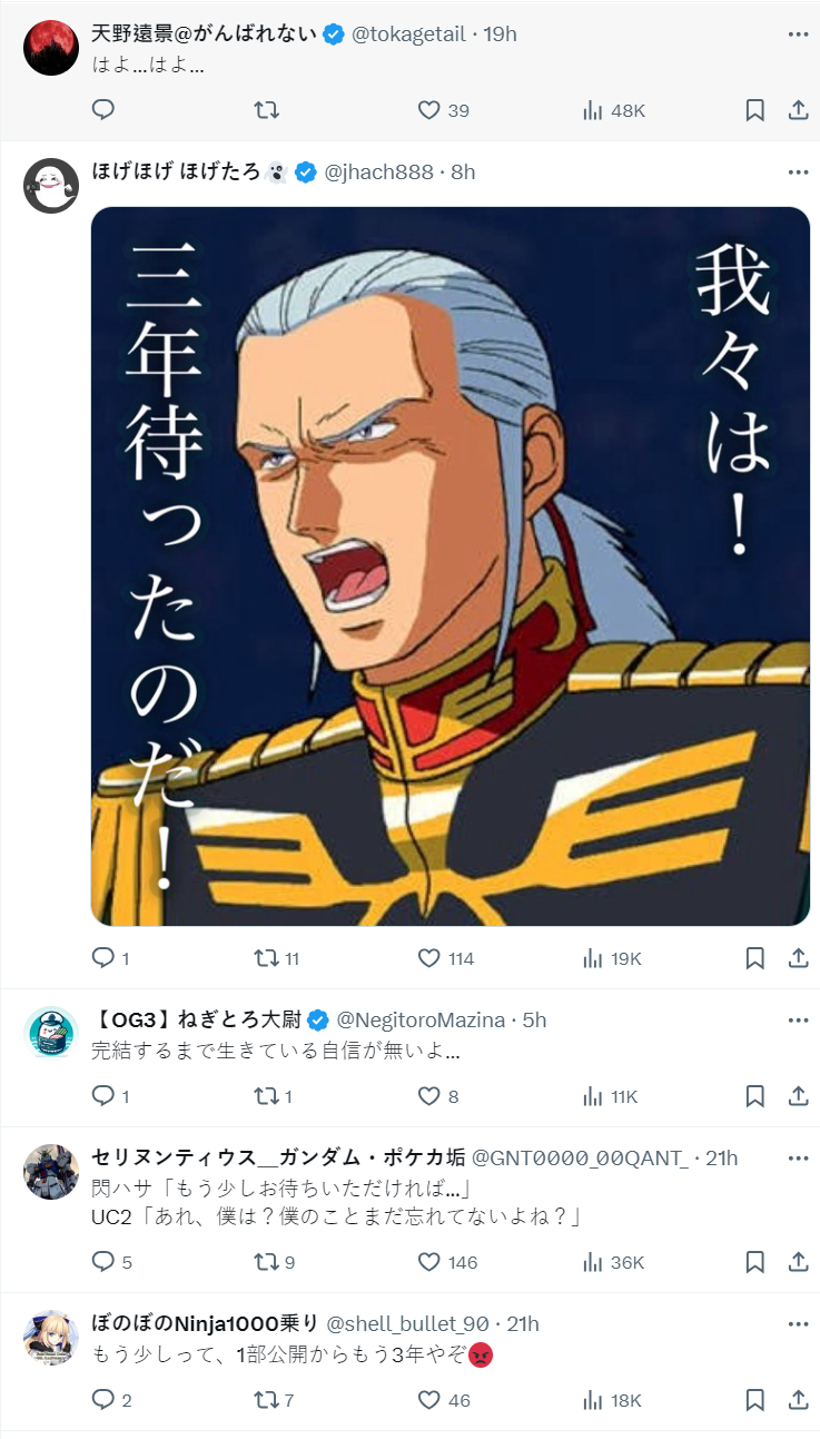 多數網友當然對此還是抱持悲觀,雖說《機動戰士鋼彈 閃光的哈薩威》票房出色,但官方給人的感覺似乎非常消極,沒有那種想趁勢出擊的感覺,三部曲完結都不知道何時了。