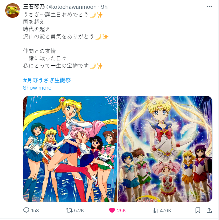 替月野兔配音的聲優三石琴乃也在今日發文,對這個經典角色獻上無比的生日祝福。