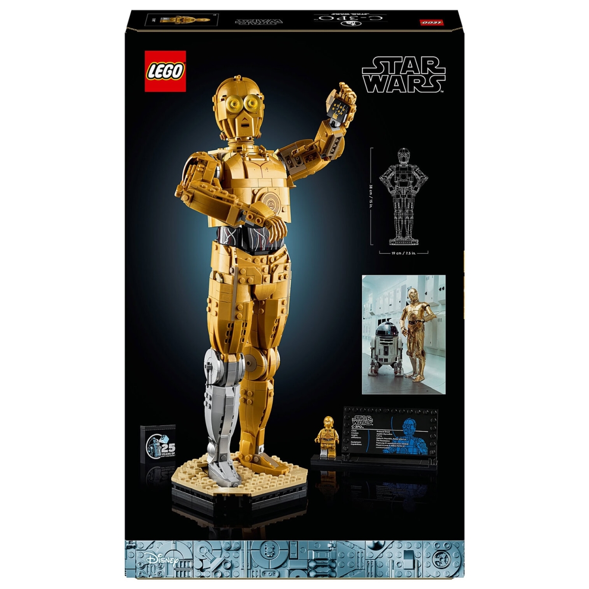 除了 C-3PO 磚拼模型本體,商品內容還有 C-3PO 人偶、資訊版、慶祝「樂高星際大戰」系列 25 週年的紀念零件,底座則是有塔圖因沙漠地形的味道,如果跟先前的「75379 R2-D2」一起搭配的話,高度分別會是 38 與 24 公分,絕對是要擺在一起展示的,超級棒!