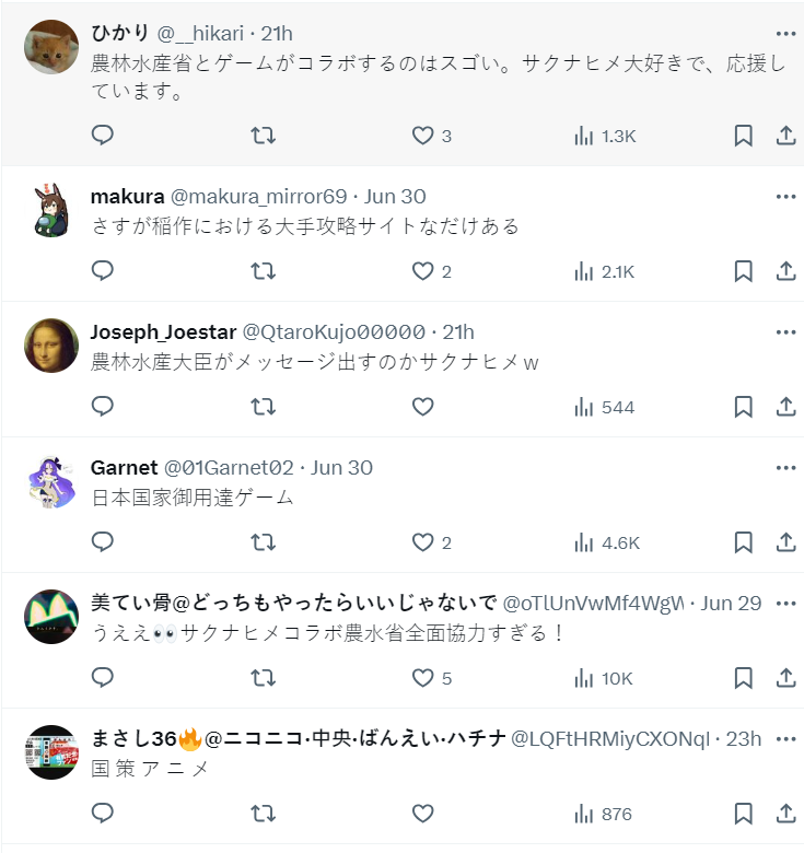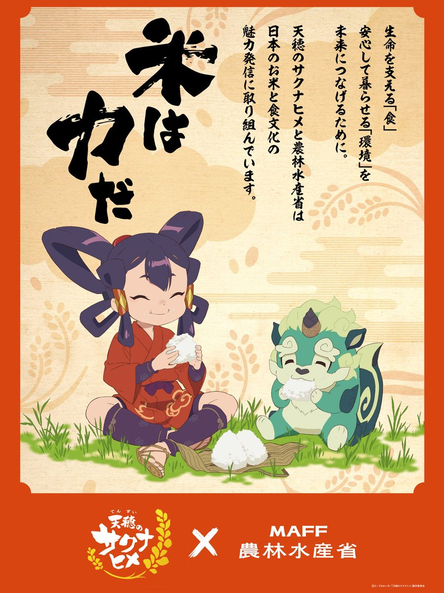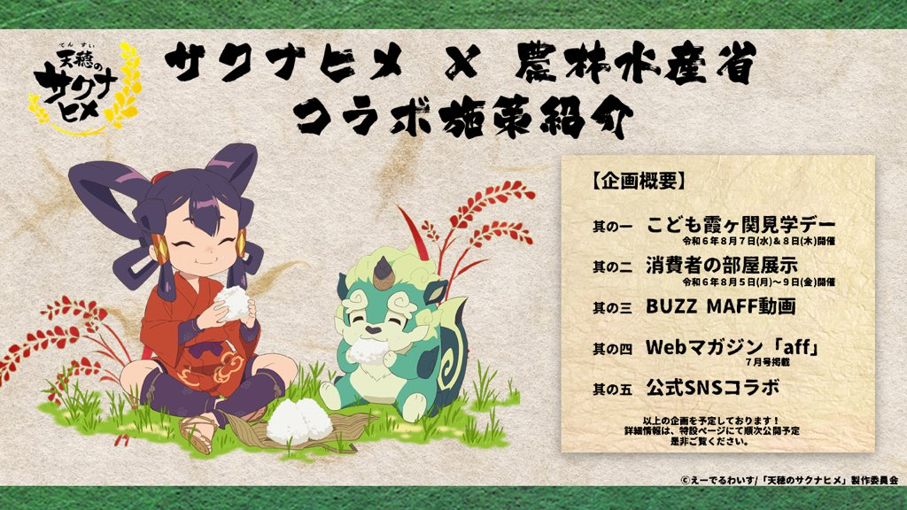 沒想到時隔約 2 年半,動畫即將播出之際真的與農林水產省協力,並由大臣坂本哲志與同仁拍攝慶賀影片,表達對雖然當時遊戲推出時許多玩家湧入農林水產省網站讓他們大吃一驚,不過真心認為讓大家願意重視米食文化與農業的底蘊,十分感謝這個遊戲帶來的效應。