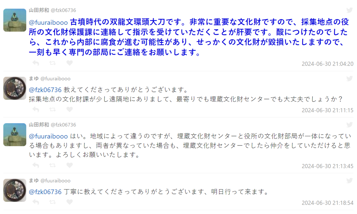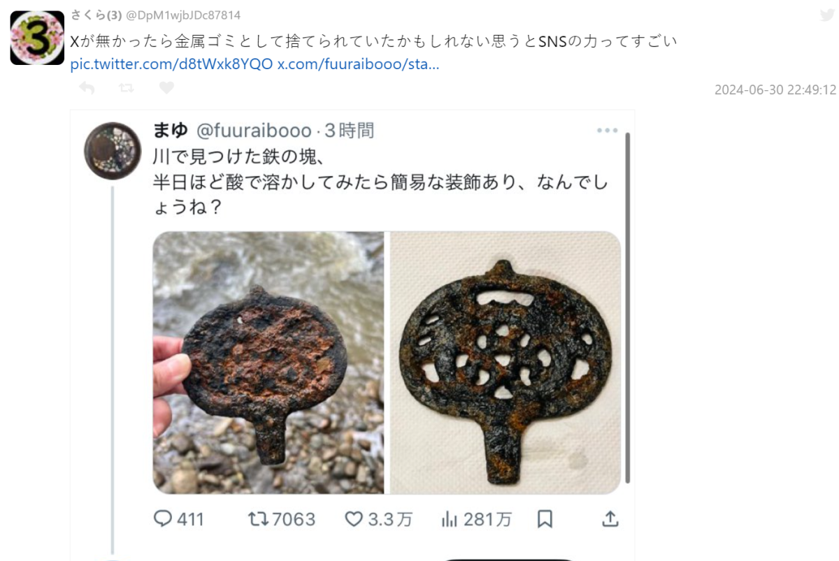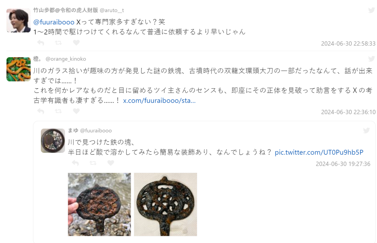 沒想到發在 X 上後馬上被有歷史專業的網友察覺,這是來自於日本古墳時代的双龍文環頭大刀,約為公元 3 世紀初期到公元 7 世紀初期的古代文物,是非常重要的文化財產。也懇請推主聯繫收集地政府機關的文化財產保護部門並接受指示保管。如果被酸浸泡過,內部可能會發生腐蝕,從而損害這珍貴的文化財產,因此請盡快聯繫專業部門。
