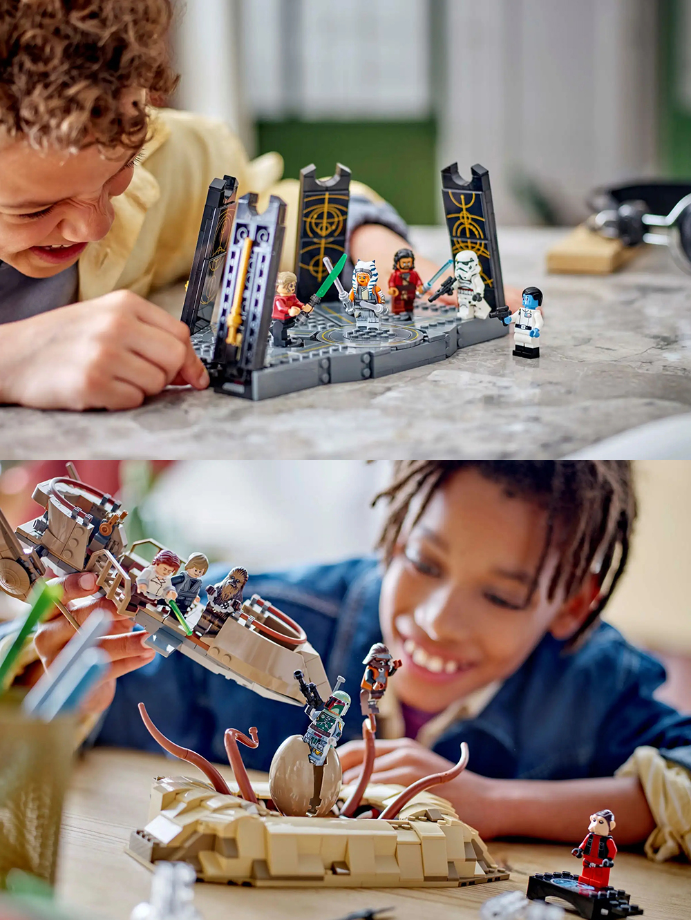再來是根據《星際大戰六部曲:絕地大反攻》經典一幕製作的載具+場景組,不管是沙漠小艇(Desert Skiff)還是頗具份量的沙羅蛇巨坑都絕對是星戰老粉的心頭好!同時也能將本作視為 2017 年推出之「75174 沙漠小艇逃脫」的升級版,人偶陣容更是毫無雜魚!包含路克、韓·索羅、丘巴卡、身穿偽裝盔甲的藍多·卡瑞辛、即將被沙羅蛇吞掉的波巴·費特,還有慶祝樂高星際大戰 25 週年的特別人偶:反抗軍的一員尼恩·南布(Nien Nunb)。