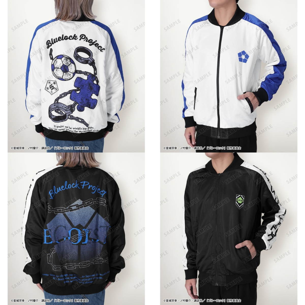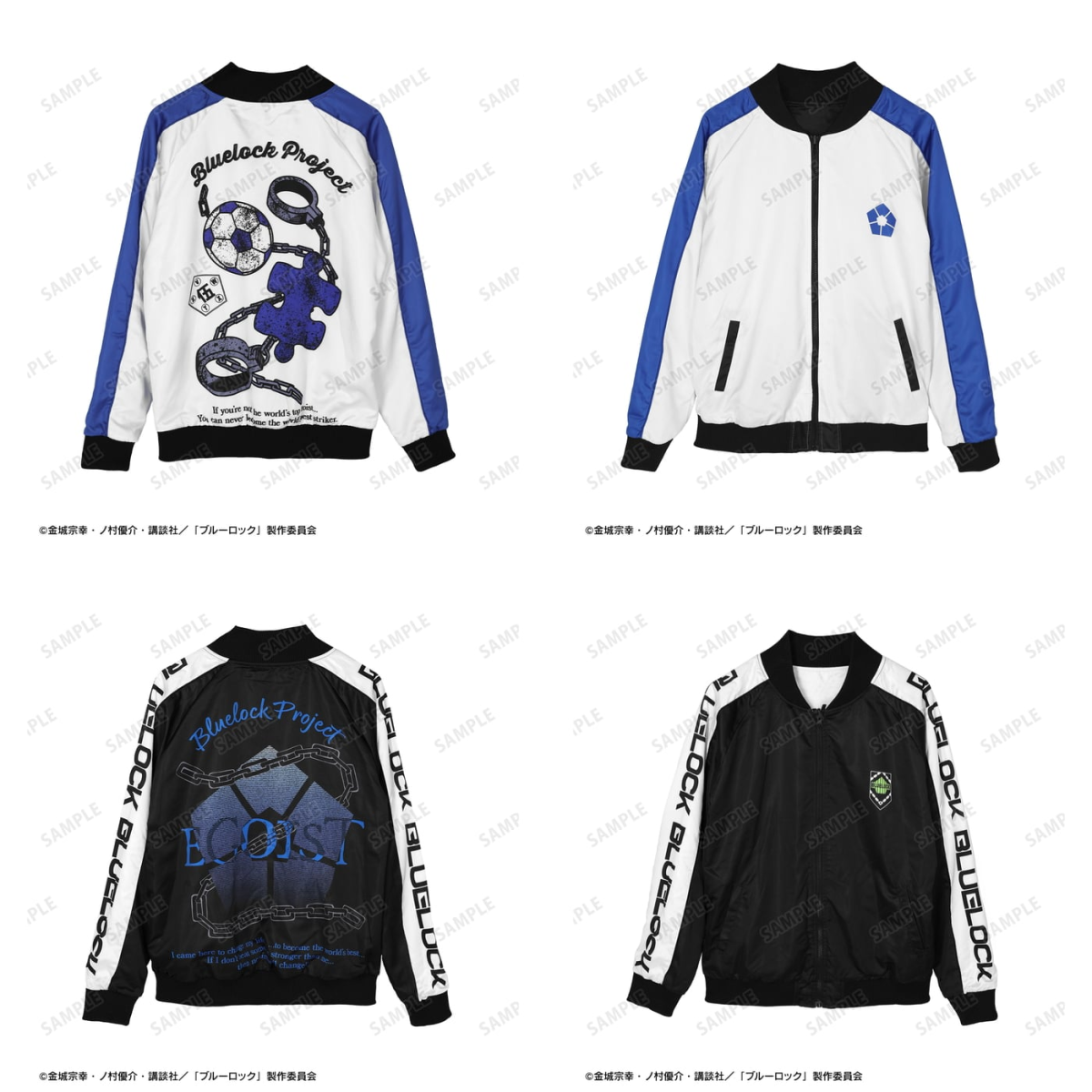 正面以藍色監獄的藍白運動外套為基礎,左胸加入藍色監獄的標誌。搭配後背大面積刺繡,英文字樣「Bluelock Project」以及足球、拼圖碎片、鎖頭的圖案,展露出作品的元素。