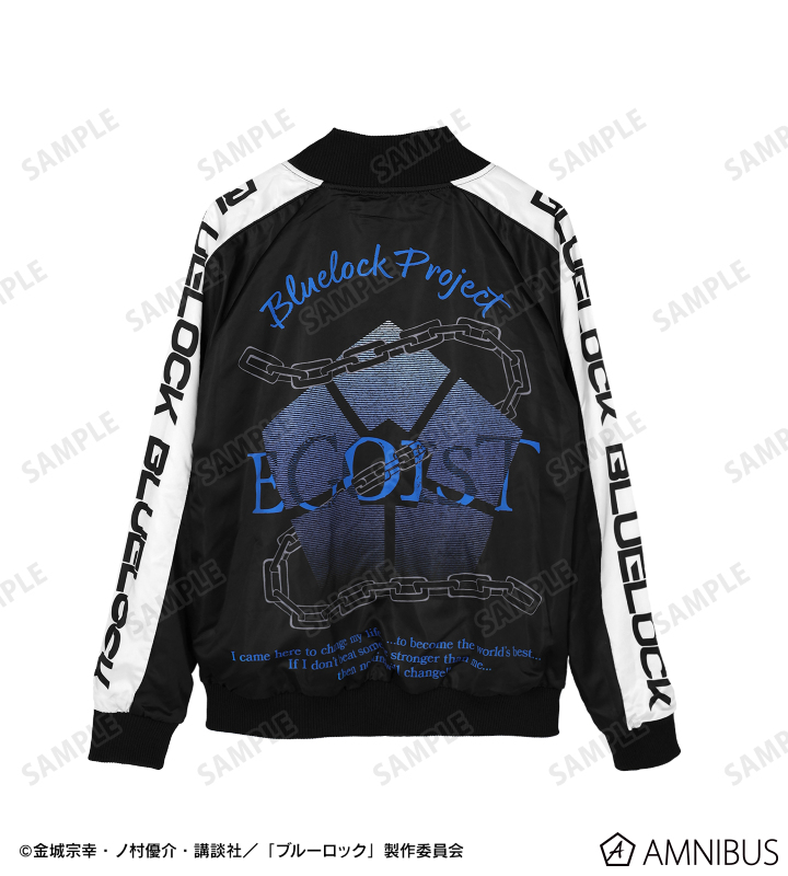正面以黑色為基底並在左胸加入藍色監獄的標誌,兩側肩膀有著顯眼的白底黑字 BLUELOCK 文字。轉向背面同樣有著大面積刺繡,除了英文字樣「Bluelock Project」外,更有著「EGOIST」,象徵作品屢屢強調藍色監獄中「自私」的性格。