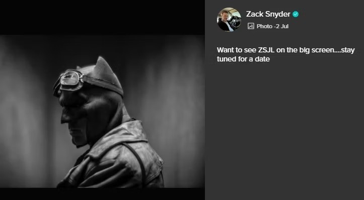 查導在他的Vero貼文上,不僅附上「小班」班·艾佛列克(Ben Affleck)所扮演的蝙蝠俠照片,在內文中他更寫道:「想在大銀幕中看見《查克·史奈德之正義聯盟》...請持續關注相關日期」。雖然除此之外,就沒有其他更多的訊息,不過這也讓不少粉絲觀眾大膽猜測,這似乎暗示了查導正在計畫將《查克·史奈德之正義聯盟》電影搬上大銀幕。
