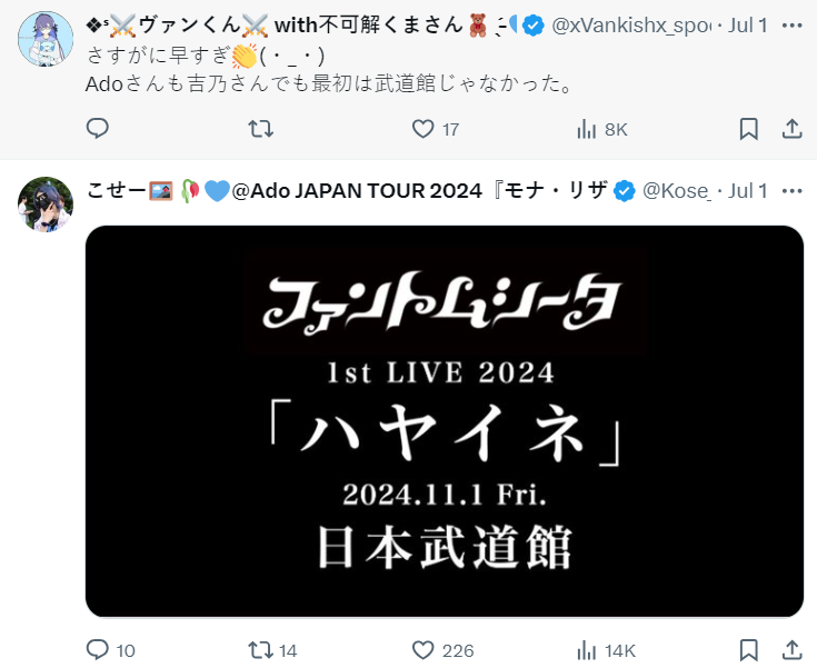 當然也是有不少正面回應的網友,認為 Ado 非常讚賞這五位選進來的「怪忌蝶」成員,還表示其實自己沒有特別指導什麼,他們都已經有很棒的實力了。或許真的對他們有很高的期許,但首場 LIVE 就要攻進武道館,也難怪對粉絲網友來說都認為太急了吧。