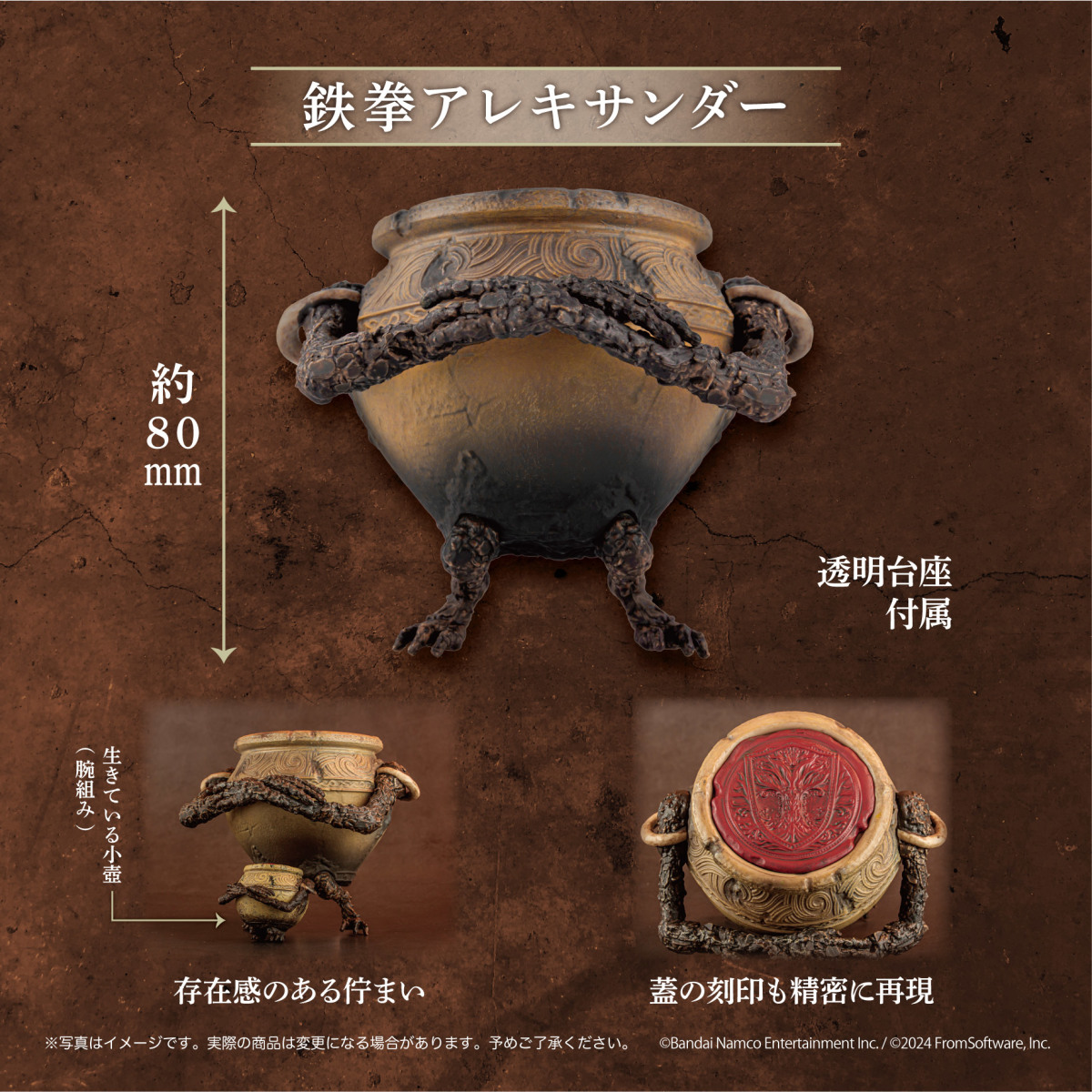 SO-TA「ELDEN RING 小壺」轉蛋,在小巧的轉蛋尺寸中呈現戰士壺身上破裂的痕跡和複雜的紋路,細長的手臂也有龜裂的紋理,並施以舊化質感的塗裝,再現遊戲中的世界觀!收錄有:雙手抱胸小壺、走路小壺、張臂小壺、坐著的小壺、透明材質的特攻先鋒群的骨灰(特攻野郎們的遺灰),除了生動的姿勢與造型之外,頭上的蓋子還可以取下!