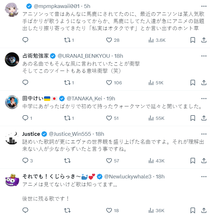 這樣的發文也吸引不少網友迴響,畢竟當時 90 年代真的對動漫族群真的比較輕視,對比現在當紅歌曲有多數都是跟動漫相關的真的形成對比。當然能創作這首到現在都還是卡拉 OK 人氣歌曲的「殘酷天使的行動綱領」,絕對是在歷史上值得肯定的。