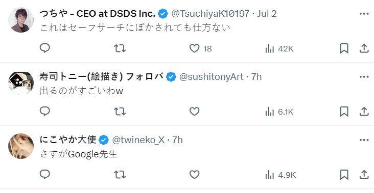 不過也不少網友注意到推主的搜尋還採用安全搜尋,應該要關掉才對吧 XD。( 網友的注意重點真的很特別... )