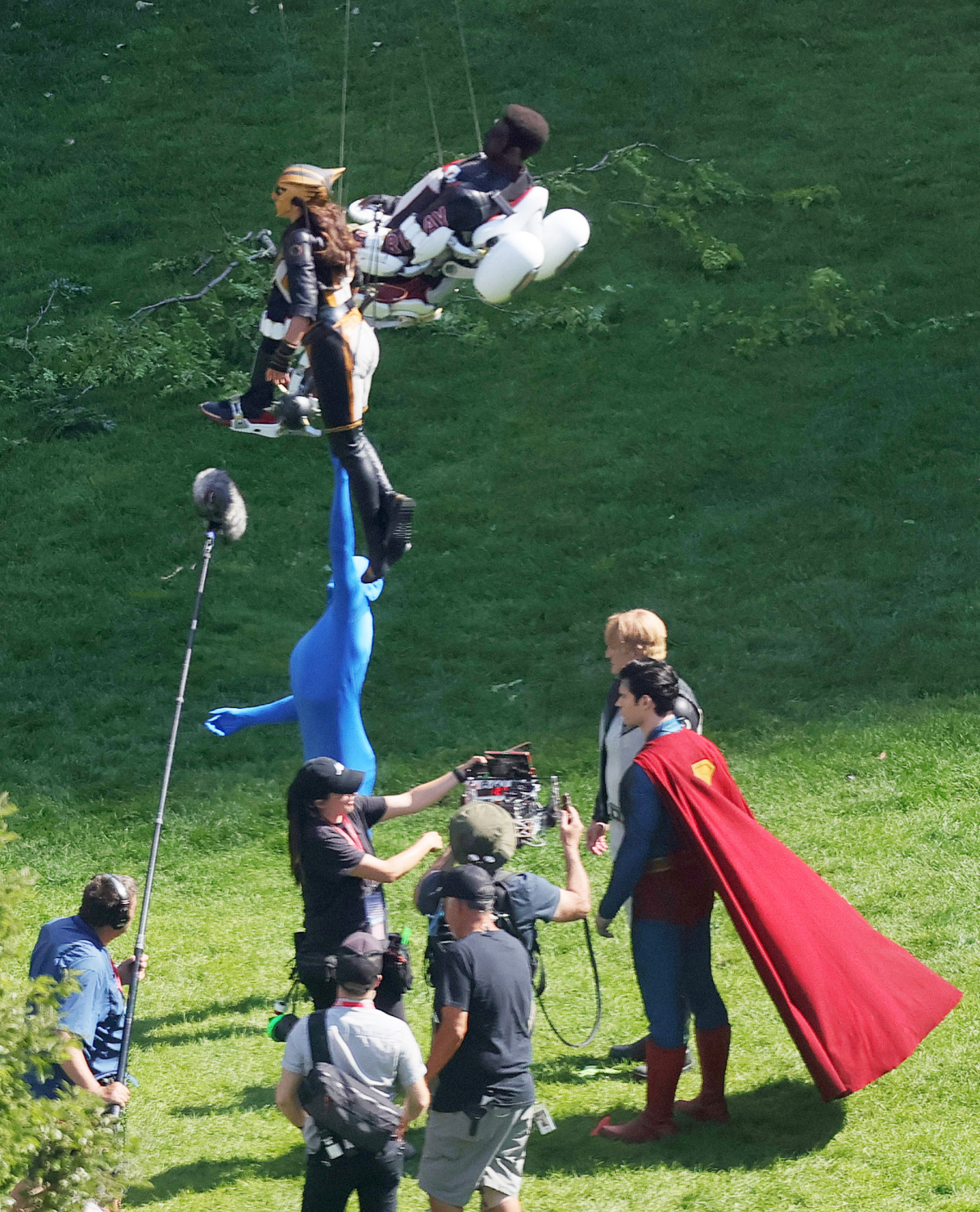 在這一次新曝光的片場照中,我們可以看見由奈森·菲利安(Nathan Fillion)扮演的「綠燈俠」蓋·加德納,還有伊莎貝拉·莫塞德(Isabela Merced)飾演的「鷹女」,在本作中的戰袍設計與整體造型,與艾迪·蓋瑟吉(Edi Gathegi)的卓越先生一起,似乎是在拍攝飛行的場面。