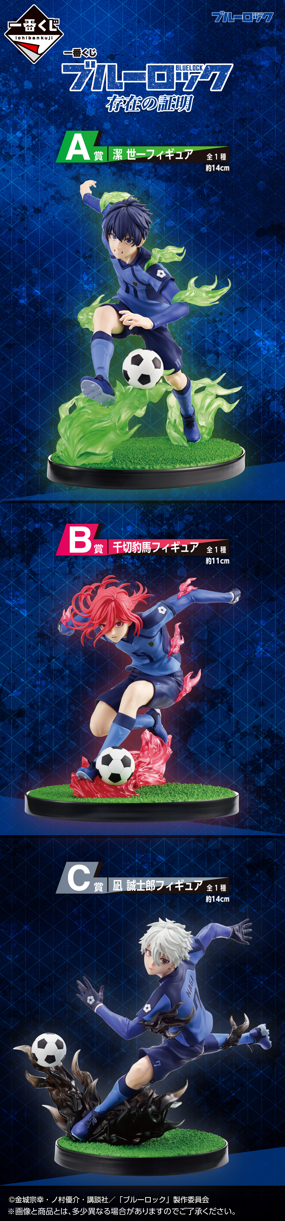 本次的「BLUE LOCK 藍色監獄 存在的證明」提供 A~I、最後一賞與雙重中獎賞等不同級別的賞品。目前搶先公開了 A~C 賞的角色模型商品圖,分別為潔世一、千切豹馬以及凪 誠士郎,每款都以細膩的動態結合特效件呈現出帥氣的踢球姿勢,頭髮與衣服也配合身體呈現飄逸的動態,搭配製作成草地的底座再現動畫中展現的魄力!