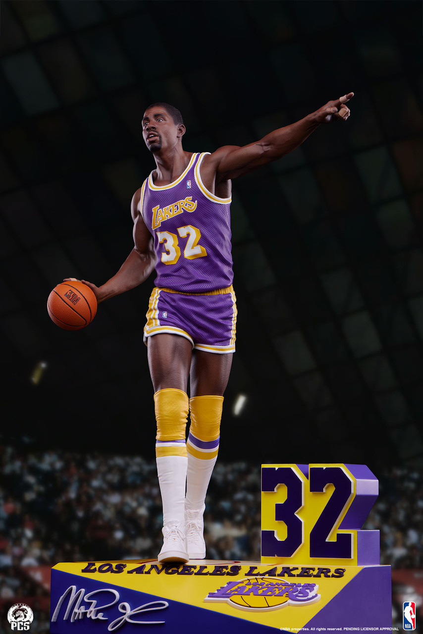 本作高約 59.6 公分,再現了巔峰時期身穿湖人隊 32 號球衣的魔術強森,右手運球、左手伸出食指彷彿在指揮隊友跑位的動作呈現相當生動,一前一後的雙腿、80 年代年輕時的面部輪廓、全身肌肉線條的形塑,以及球衣、長襪、球鞋的描繪都十分細緻,看著看著真的回憶起魔術強森當年在場上穿梭自如的靈動姿態!底座則是根據球場、洛杉磯湖人隊、數字 32 的背號,還有魔術強森的簽名來設計,並注入 PCS 旗下 NBA 商品的主題風格。