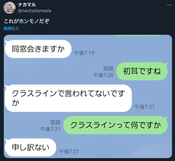 「這段對話在同學會上也會成為笑柄吧⋯⋯啊哈哈⋯⋯」、「真正的『陰角』從一開始就沒有會這樣聯絡自己的朋友了,你這真貨判定我只能打一個問號」、「我的話,在同學會名單上被標記成身故了。而且是從40年前開始。」(這也太慘了吧!!)