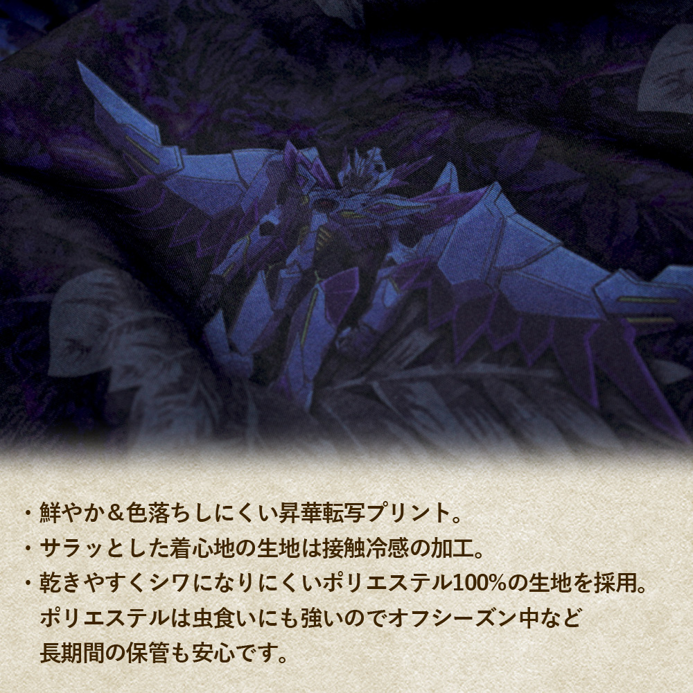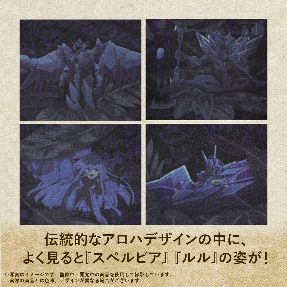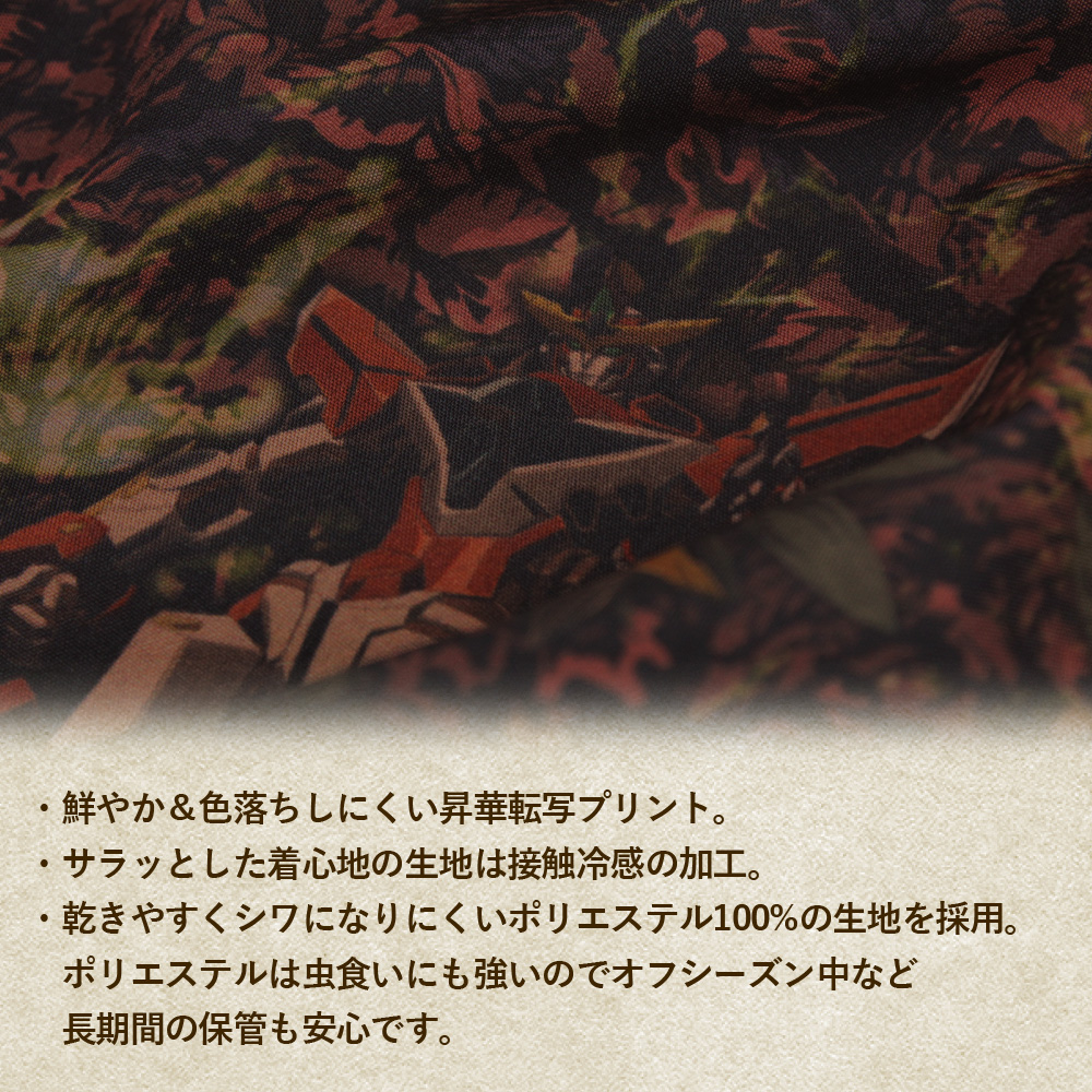 設計以作品中的象徵夏季的植披為基底,在其中加入了人物與機體的插圖為背景,展現不同過往的夏日氣息花紋滿版圖案,搭配出絕妙的效果。整體印刷採用熱昇華轉印技術,不僅圖案不易脫落,更有著傳統印刷沒有的透氣涼感,非常適合夏日穿著。