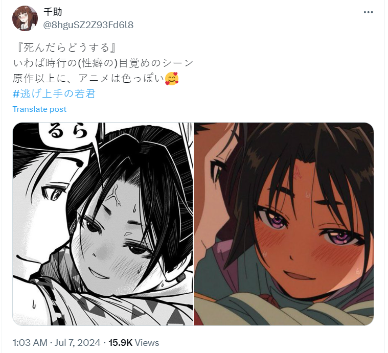 網友也對照漫畫原作與動畫的表現,可以看得出來同一幕動畫更加色氣不少,只能說製作的 CloverWorks 很懂阿 www。