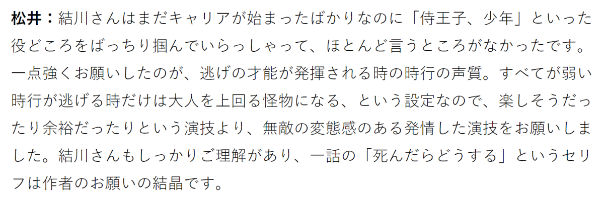 根據松井老師受媒體專訪表示,這一幕的表現算是自己的要求,希望能展露出時行的魅力,看來動畫組也滿足了松井老師的心願 XD,配音聲優結川麻希也表現非常出色。( 你看都知道找女孩子配音,很到位阿 )