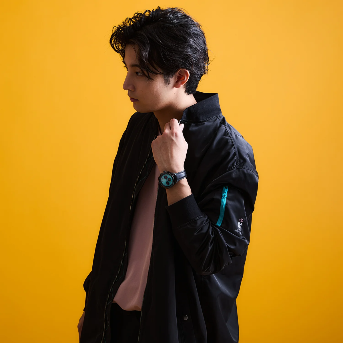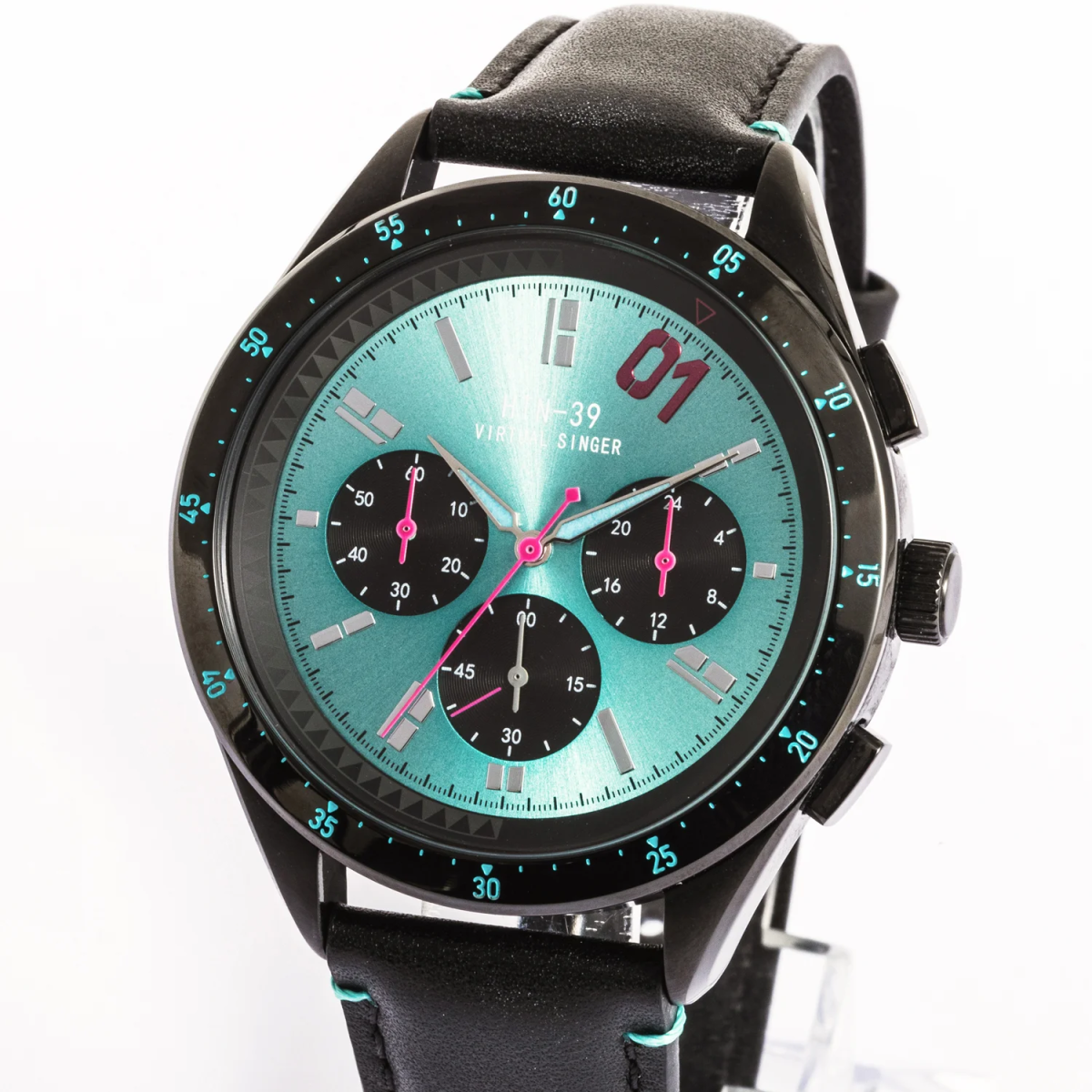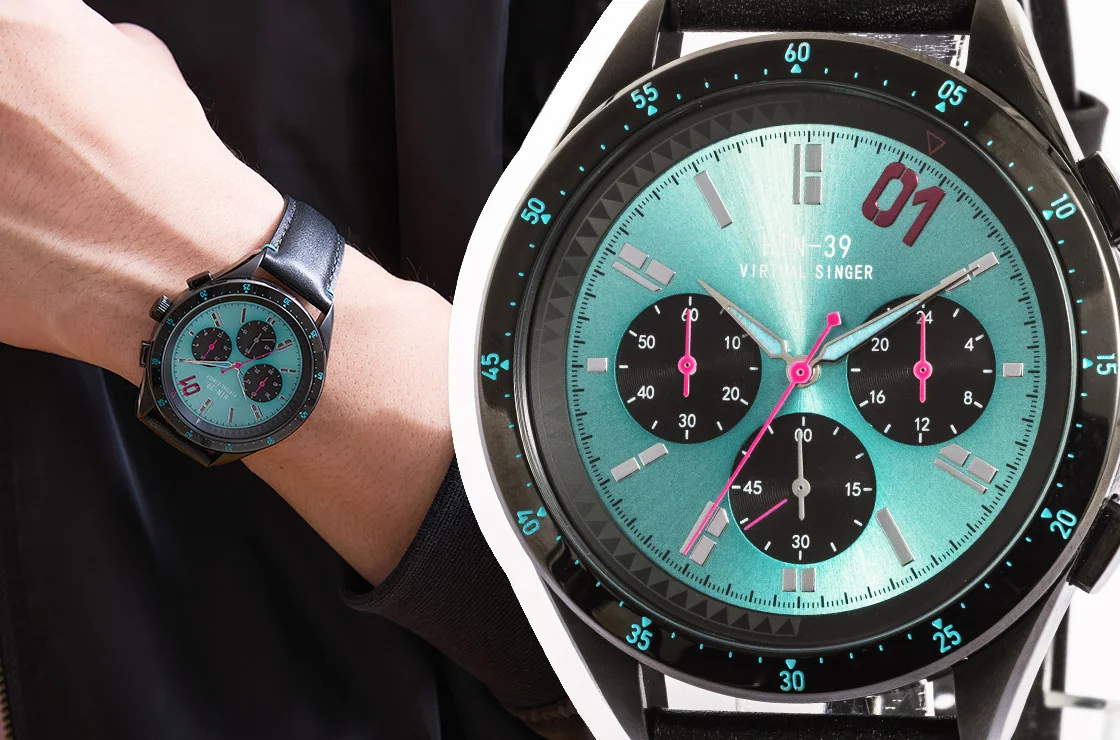 錶款整體以初音的配色為出發點,錶面以黑與湖水綠兩色色塊交織,搭配初音的代表數字「01」 以及秒針處使用初音的領帶為設計,錶背有著初音的 ICON 搭配她生日的日期,簡單有力的樣式讓你可以輕鬆搭配服裝。