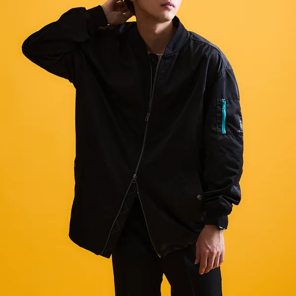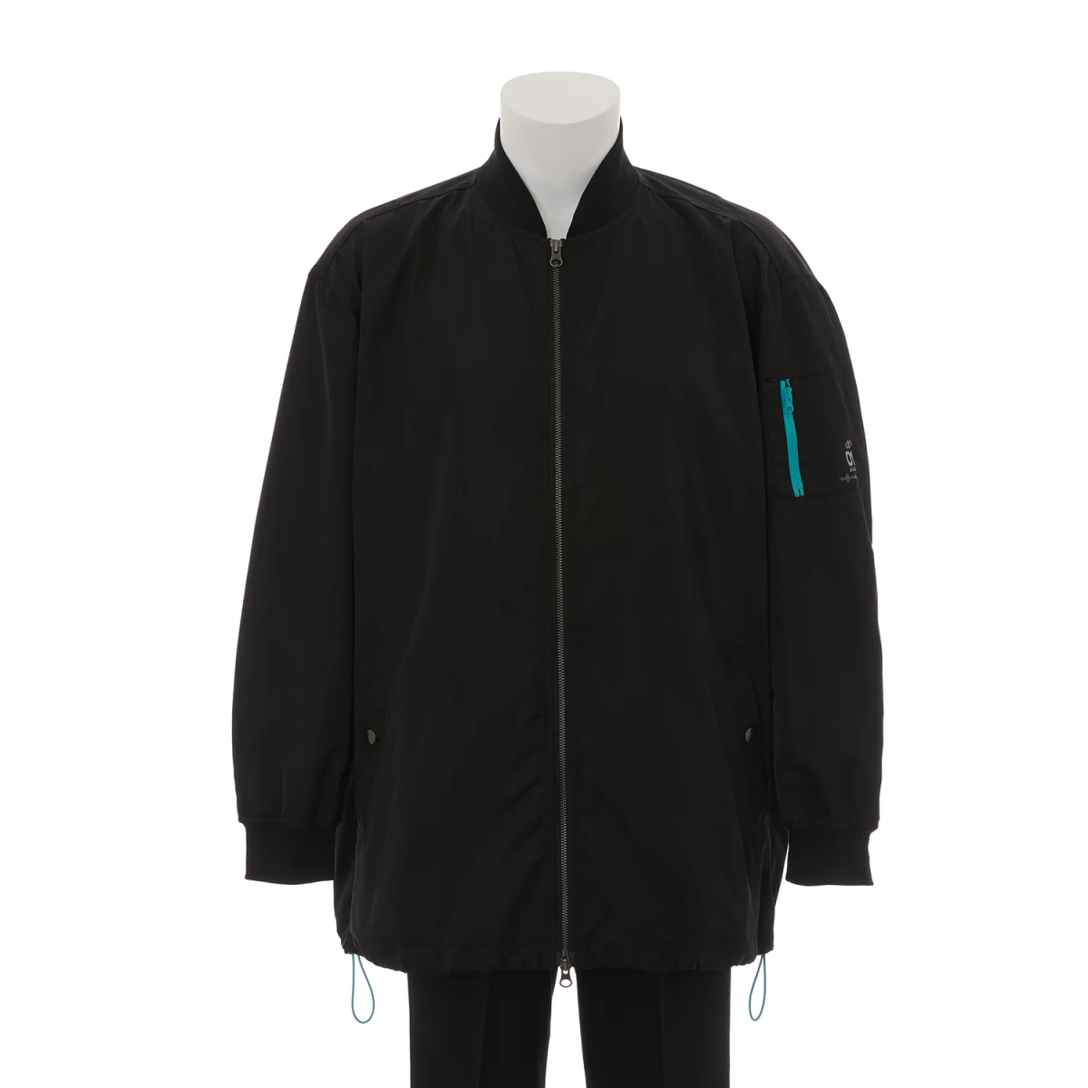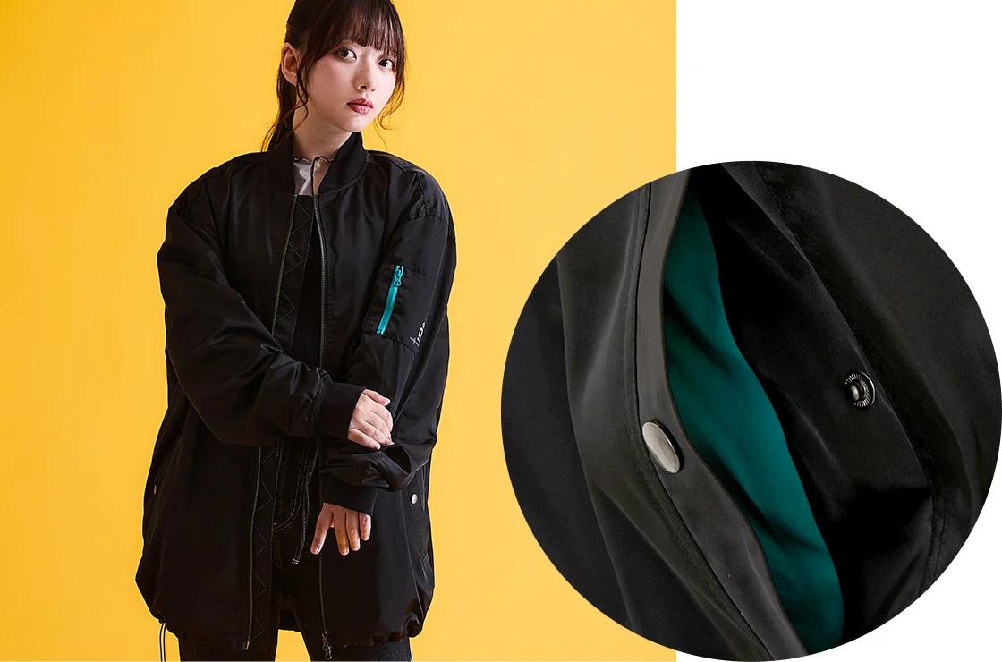 以加長下擺的飛行夾克為原型,在全黑的主軸下以湖水綠點綴,前排採用雙開拉鍊抵擋強風,穿起來十分有型。