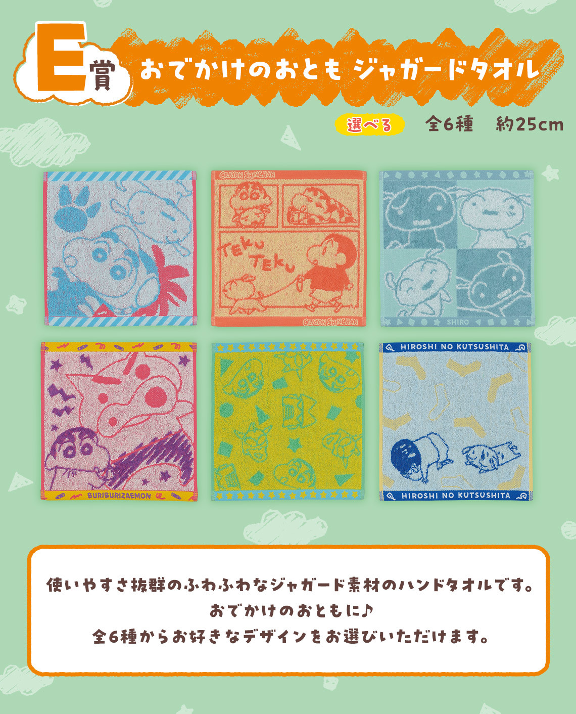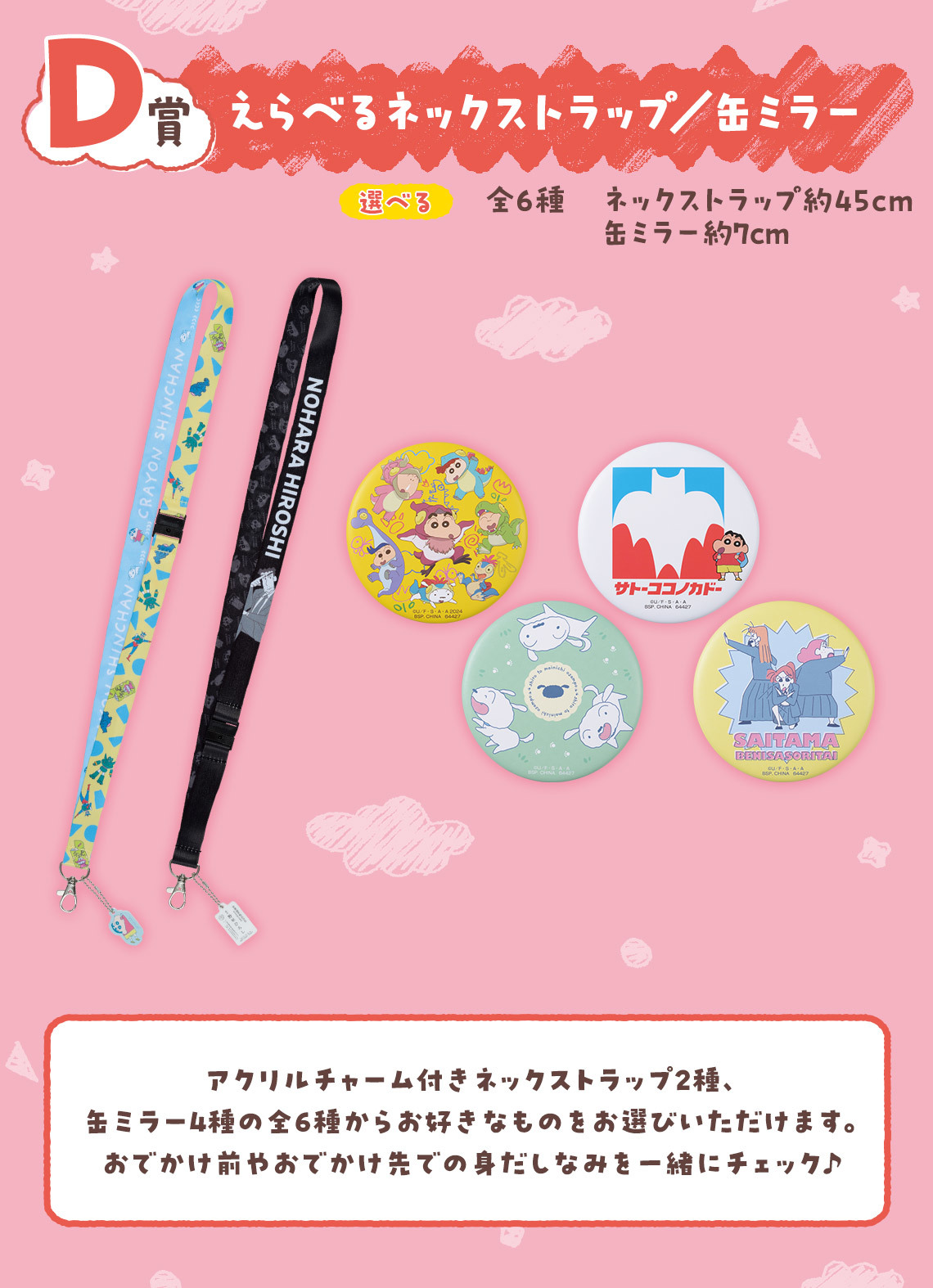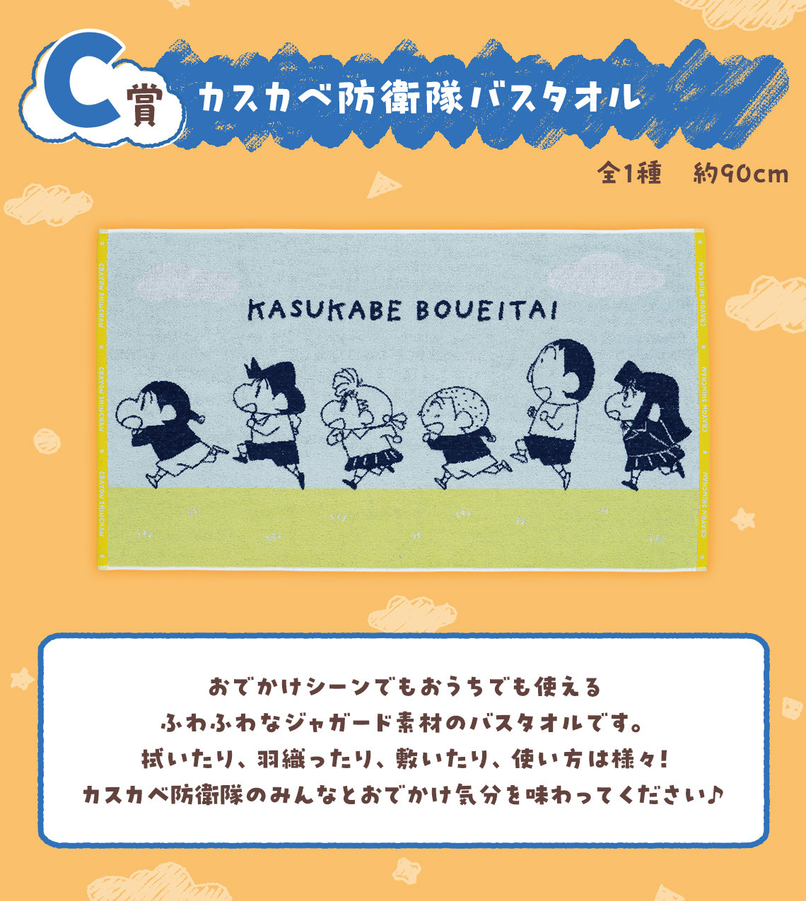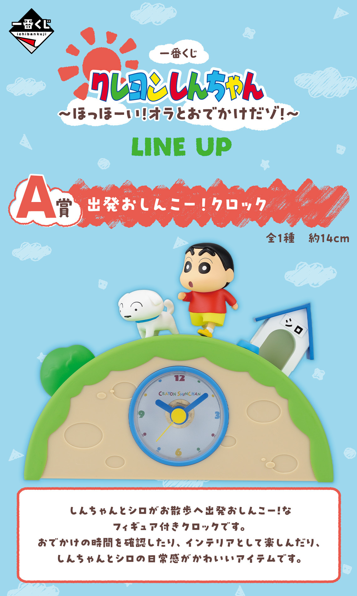 「一番賞 蠟筆小新~齁齁!和我一起出去玩~」,一共推出 A獎~F獎 6 種級別 + Last Oner獎的豐富內容!A獎為出門散步的「出發囉造型時鐘」,B獎為揹著動感超人包包的「小新絨毛布偶」,C獎是 90 公分的「春日部防衛隊浴巾」!另外還有繽紛可愛的「頸帶/小鏡子」、「毛巾」、「拉鍊袋&貼紙」等獎品!而 Last One獎是回家休息的「蠟筆小新&小白休息布偶」,穿著最新電影中的暑假服裝,玩累了就小白當枕頭呼呼大睡啦~